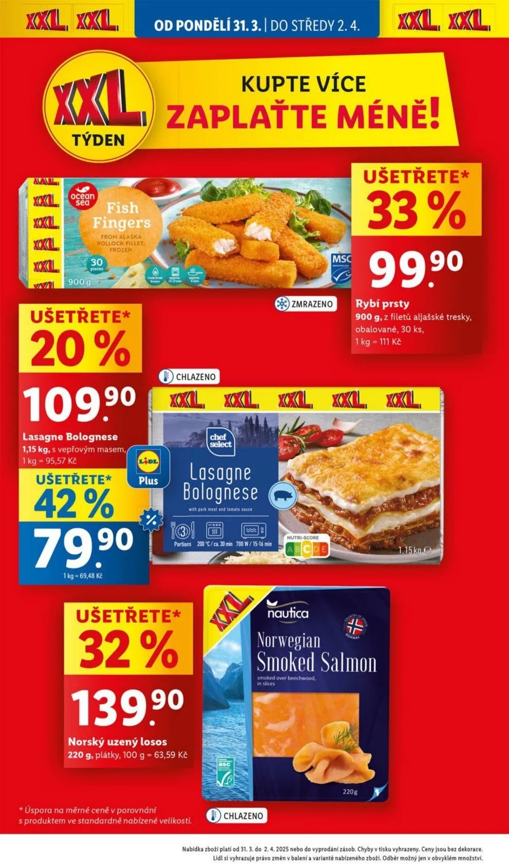 Od pondělí 31. března do středy 2. dubna máte jedinečnou příležitost ušetřit na skvělých produktech v obchodě Lidl! V nabídce najdete lahodné lasagne bolognese s vepřovým masem, které si můžete pořídit za výhodnou cenu 95,57 Kč za 1,15 kg. Dále nabízíme zmrazené obalované filetové kousky aljašské tresky, 900 g za 111 Kč za kilogram. Nezapomeňte také na norského uzeného lososa, který je k dostání v plátcích, 220 g za 63,59 Kč za 100 g. Tato akční nabídka platí do vyprodání zásob, tak neváhejte a přijďte si pro své oblíbené produkty!