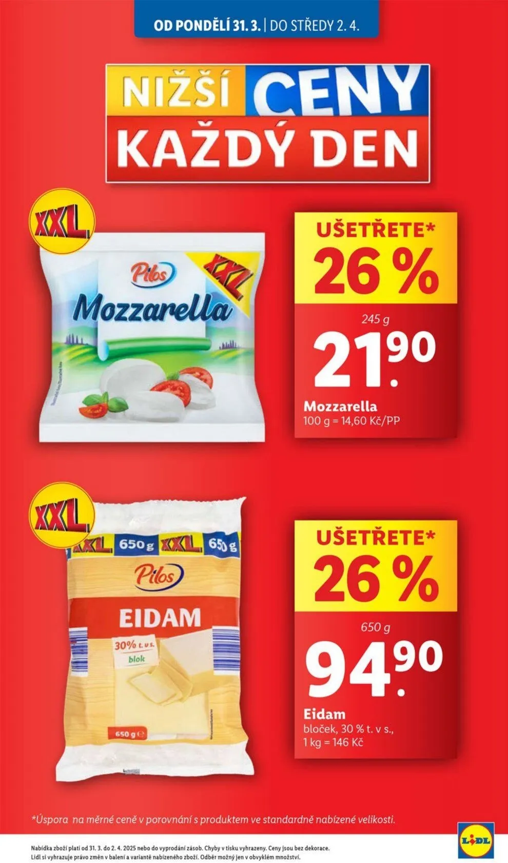 Od pondělí 31.3. do středy 2.4. máte možnost zakoupit skvělé produkty v obchodě Lidl. V nabídce najdete mozzarella blok o hmotnosti 660 g za výhodnou cenu, kde ušetříte na měrné ceně. Dále je k dispozici eidam bloček o hmotnosti 650 g s obsahem 30 % t. v s., také za skvělou cenu. Nezapomeňte, že nabídka platí do vyprodání zásob. Těšíme se na vaši návštěvu!