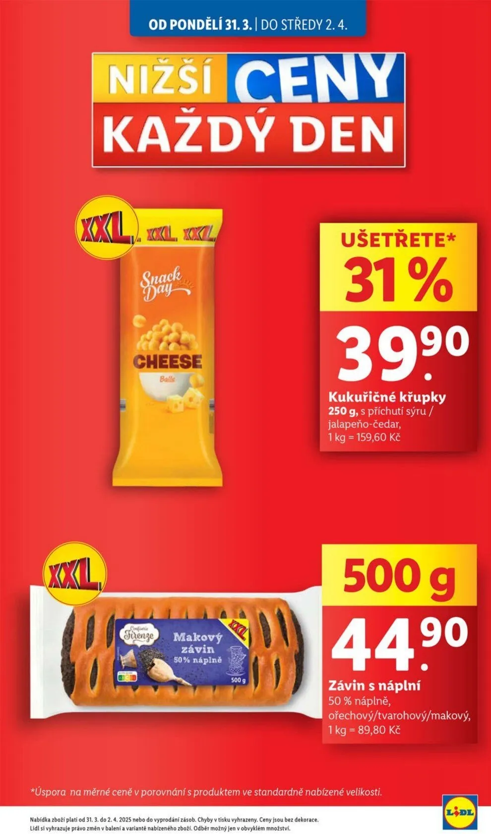 Od pondělí 31. března do středy 2. dubna si v Lidlu můžete vychutnat skvělé nabídky! Každý den máme v akci lahodný makový závin s 50 % náplně, a to za skvělou cenu 89,80 Kč za kilogram. Dále si nenechte ujít kukuřičné křupky s příchutí sýru nebo jalape?o-čedar, které jsou k dostání v balení 250 g za 39 Kč. Ušetřete na měrné ceně v porovnání s běžně nabízenými produkty. Nabídka platí do vyprodání zásob, tak neváhejte a přijďte si pro své oblíbené pochoutky!