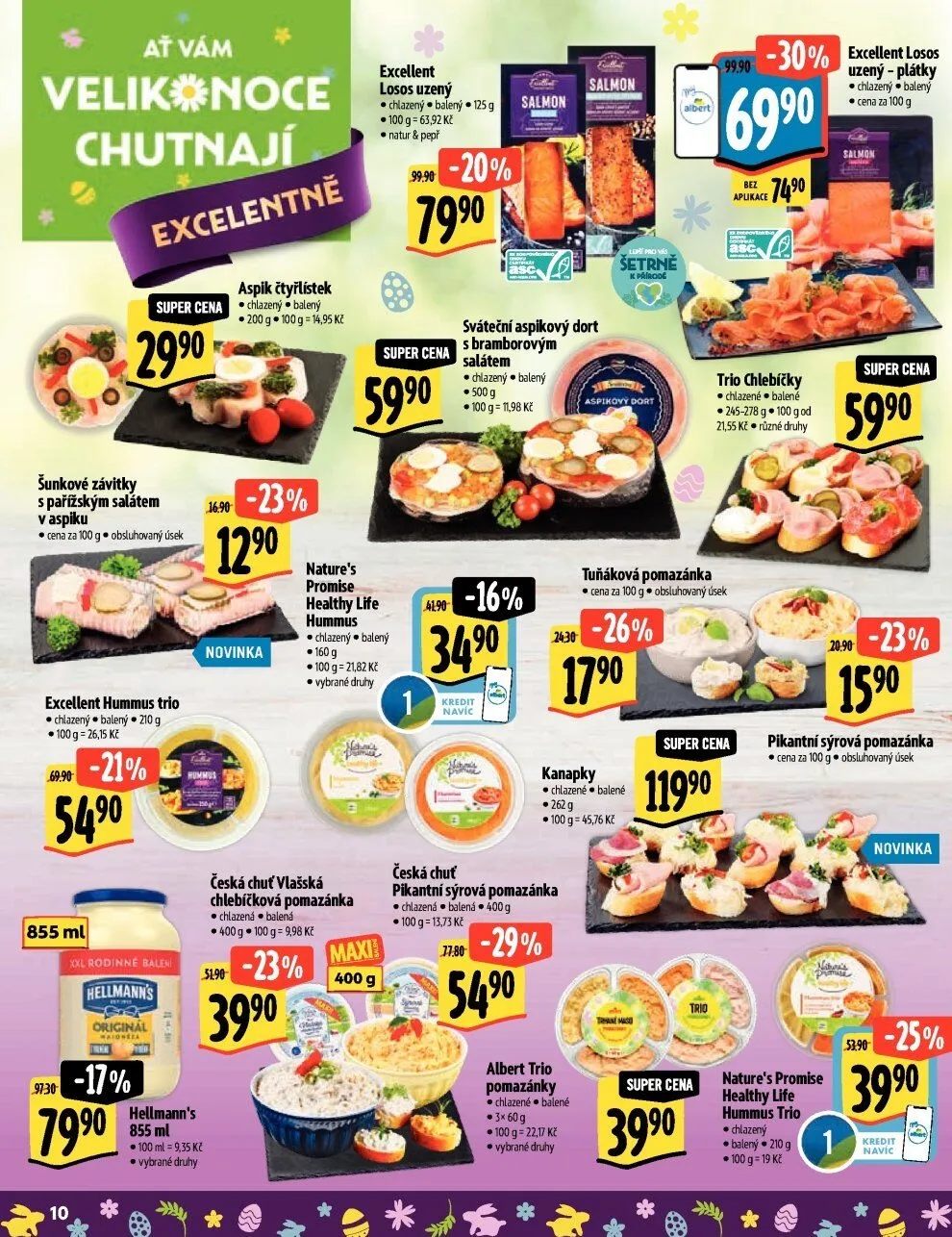 V letáku obchodu Albert najdete širokou nabídku chutných produktů za super ceny. Mezi nimi se objevují chlazené a balené delikatesy jako uzený losos, šunkové závitky s pařížským sýrem a tuňáková pomazánka. Novinkou je hummus od značky Nature's Promise, který je k dostání v různých variantách.