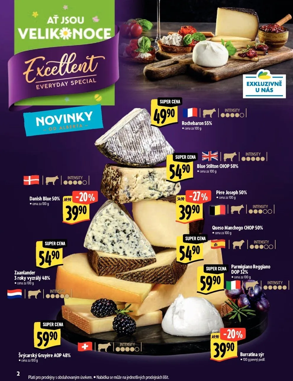 V letáku obchodu Albert najdete širokou nabídku kvalitních sýrů za super ceny. Mezi novinkami se objevuje Danish Blue s 50% obsahem tuku, který je k dostání za výhodnou cenu za 100 g. Dále si můžete vychutnat Roky vyzrálý sýr s 48% tuku, také za skvělou cenu za 100 g.