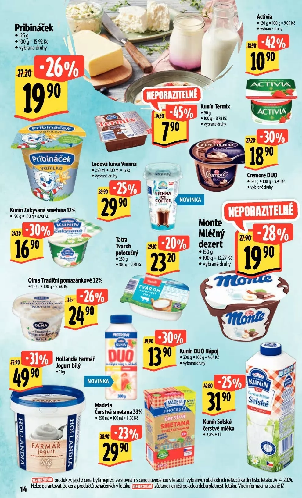 prodlkty, jejichž cena byla ve srovnání s cenou uvedenou v letácích ybraných obclndních řetězců ke dni tisku letáku 24.4.2024.
