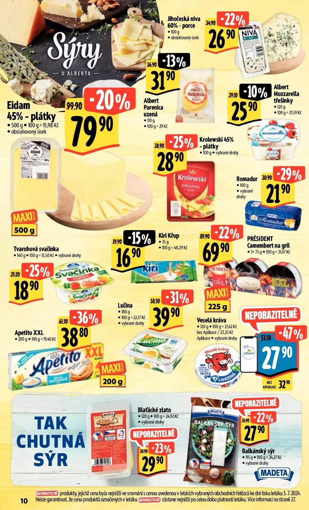 produkty, jejichž cena byla nejnižší ve srovnání s cenw uvedenou v letácích vybraných úhodních řetězců ke dli tisku letáku 3.7.2024.