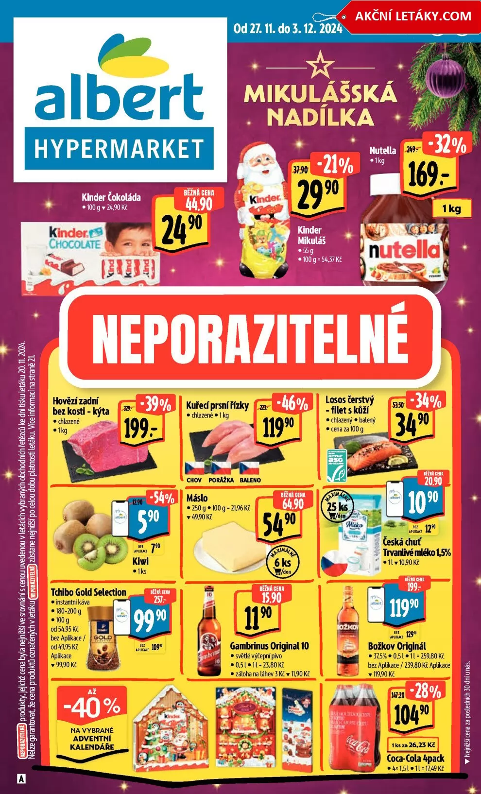 V letáku obchodu Albert na období od 27.11. do 3.12.2024 najdete skvělé nabídky na různé produkty. Mezi nimi je Nutella 1 kg za 299 Kč a Kinder čokoláda za 44,90 Kč. Pro milovníky masa je v nabídce hovězí zadní bez kosti za 199 Kč a kuřecí prsa chlazené za 119,90 Kč. Nezapomeňte také na čerstvého lososa, který je k dostání za 34,90 Kč za 100 g.