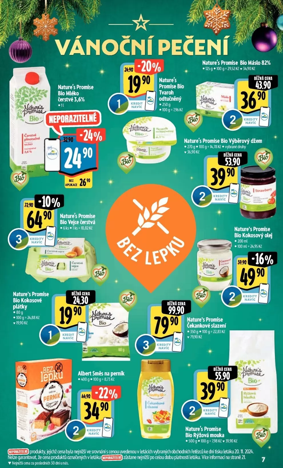 V letáku obchodu Albert najdete širokou nabídku produktů pro vánoční pečení. Mezi nimi se objevuje bio máslo Nature's Promise s obsahem 82% tuku, čerstvé bio mléko a bio vejce. Dále si můžete vybrat odtučněný bio tvaroh a výběrový bio džem, který je ideální pro sladké dobroty.