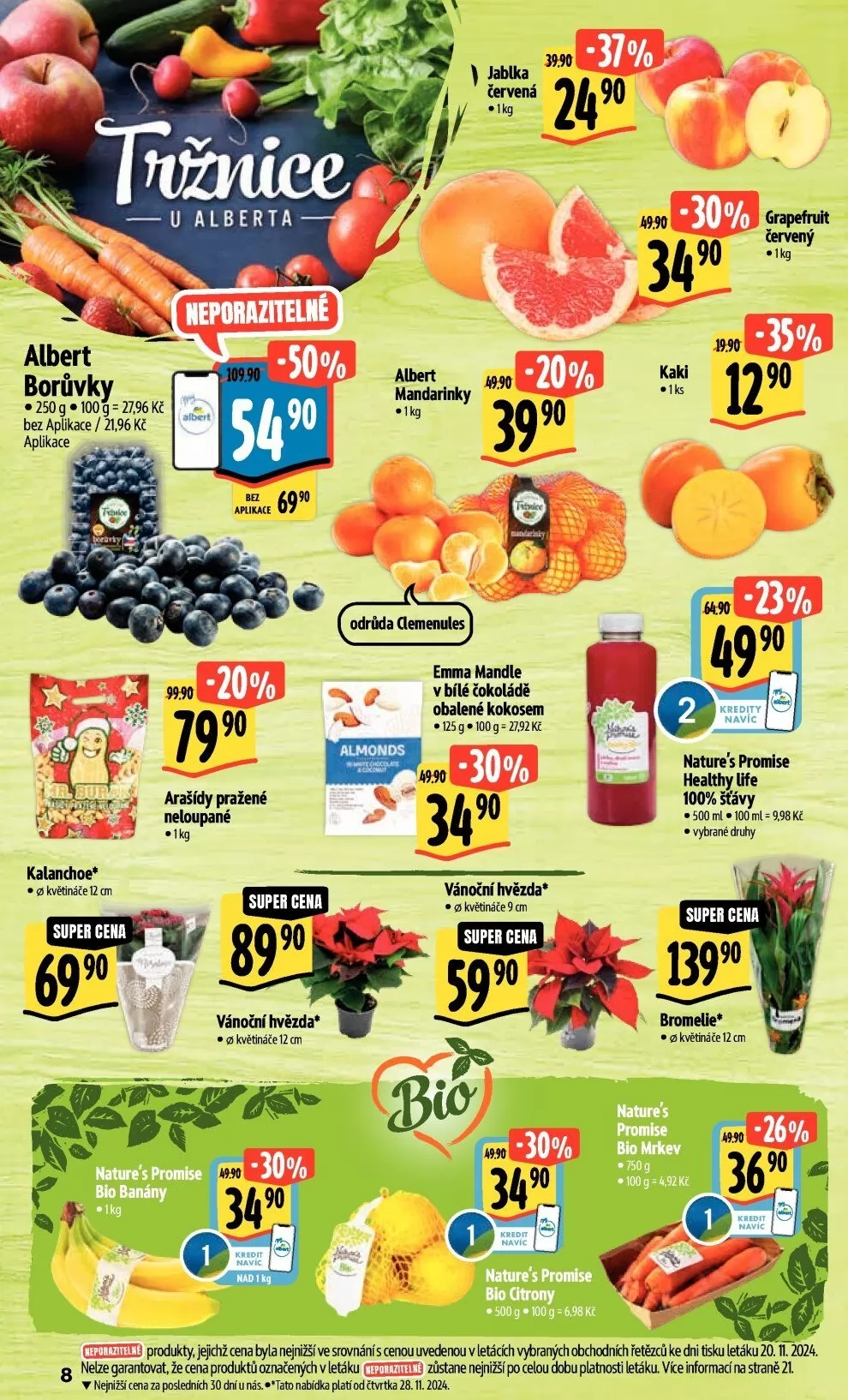 V letáku obchodu Albert najdete širokou nabídku čerstvých produktů za skvělé ceny. Mezi nimi jsou neporazitelné jablka za 49 Kč/kg, šťavnaté mandarinky a borůvky bez aplikace za 21,96 Kč. Nezapomeňte také na arašídy pražené neloupané a bio banány od Nature's Promise.
