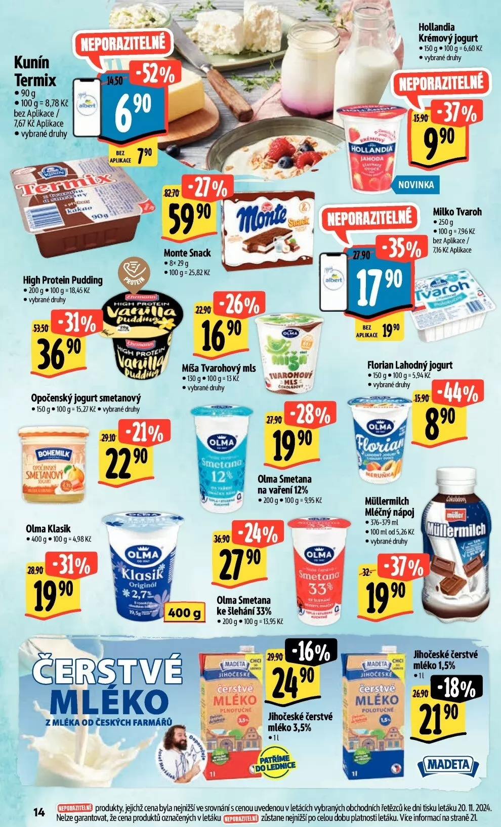 V letáku obchodu Albert najdete širokou nabídku mléčných produktů, které potěší každého milovníka kvalitních potravin. Mezi vybranými druhy se objevují krémové jogurty Hollandia, lahodné tvarohy Milko a novinky jako Monte Snack. Nezapomeňte také na Opočenský jogurt smetanový a Florian jogurt, které jsou ideální pro osvěžení.