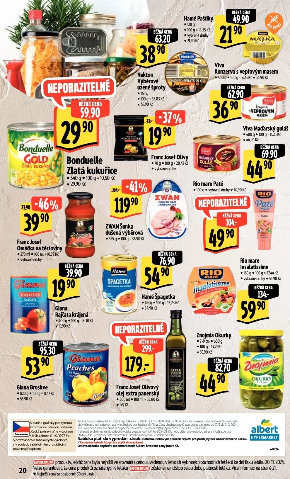 V letáku obchodu Albert najdete širokou nabídku kvalitních produktů za výhodné ceny. Mezi nimi se objevují výběrové uzené šproty od značky Nekton za 36,90 Kč, nebo Hamé paštiky v různých druzích za 21,90 Kč. Pro milovníky masa je tu konzerva s vepřovým masem Viva za 36,90 Kč a maďarský guláš za 69,90 Kč.