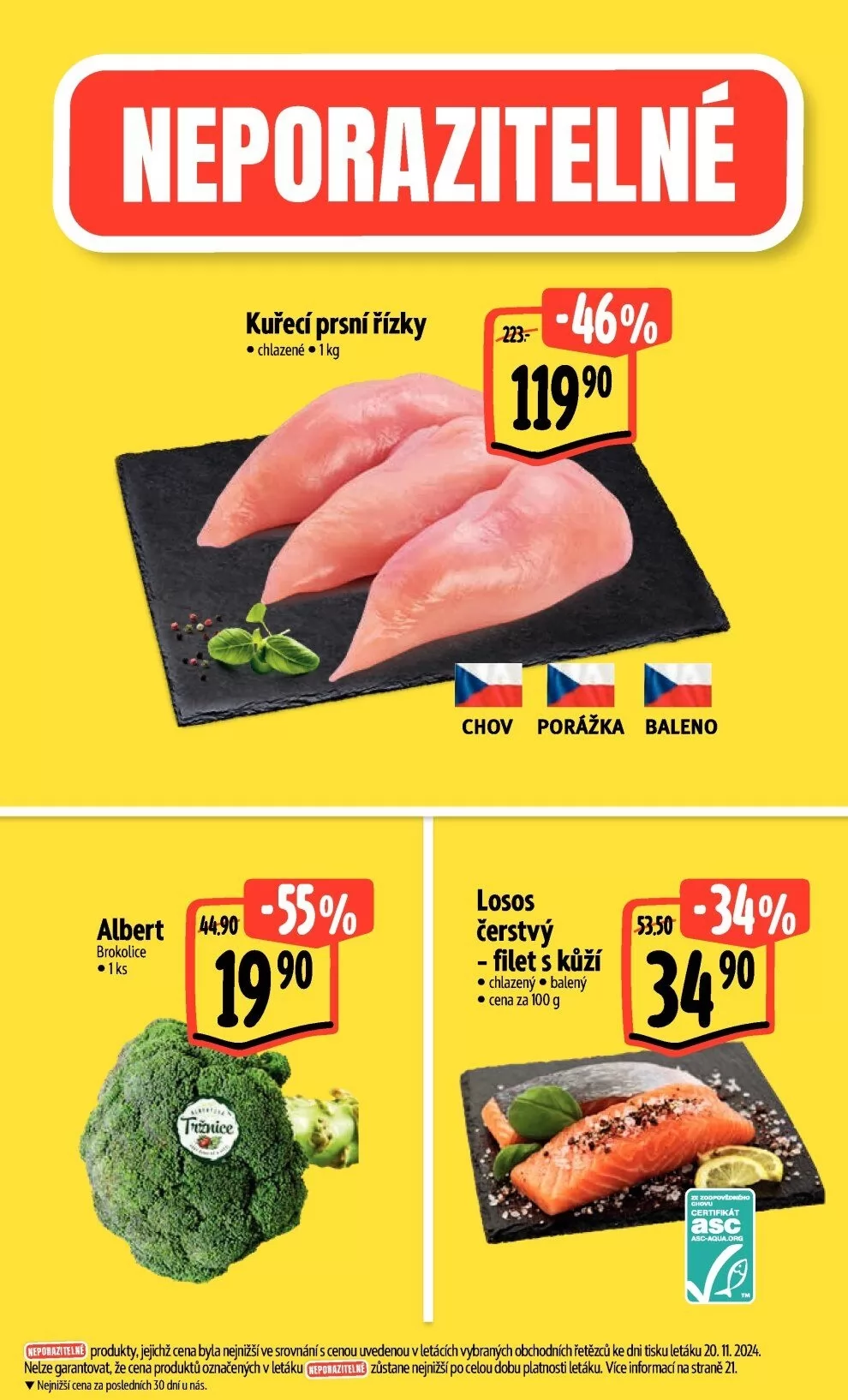 V letáku obchodu Albert najdete širokou nabídku kvalitních produktů. Mezi nimi se vyjímají kuřecí prsní řízky, které jsou chlazené a balené, s cenou 119,90 Kč za 1 kg. Dále si můžete vybrat čerstvý losos, filet s kůží, který je také chlazený a balený, a jeho cena je uvedena za 100 g. Albert se pyšní tím, že nabízí produkty s nejnižší cenou ve srovnání s jinými obchodními řetězci. Nezapomeňte, že ceny se mohou měnit, a proto doporučujeme sledovat aktuální nabídku. Pro více informací se podívejte na stranu 21 letáku.