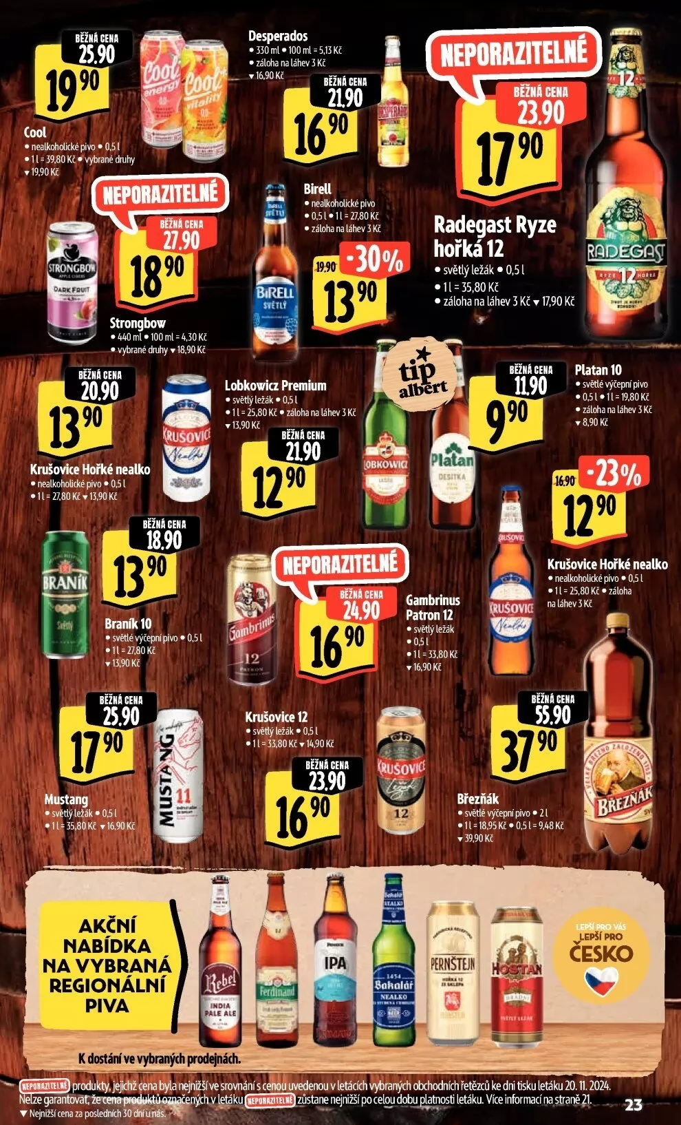 V letáku obchodu Albert najdete širokou nabídku nealkoholických a alkoholických piv za skvělé ceny. Například nealkoholické pivo Krušovice hořké je k dostání za 27,90 Kč, zatímco Braník 10 můžete pořídit za 18,90 Kč. Pro milovníky silnějších chutí je tu Desperados za 16,90 Kč a Radegast ryze hořká 12 za 23,90 Kč. Nezapomeňte také na akční nabídku vybraných regionálních piv, která jsou k dispozici za nejnižší ceny. Všechny ceny jsou uvedeny včetně zálohy na láhev, která činí 3 Kč. Navštivte nás a objevte skvělé nabídky!