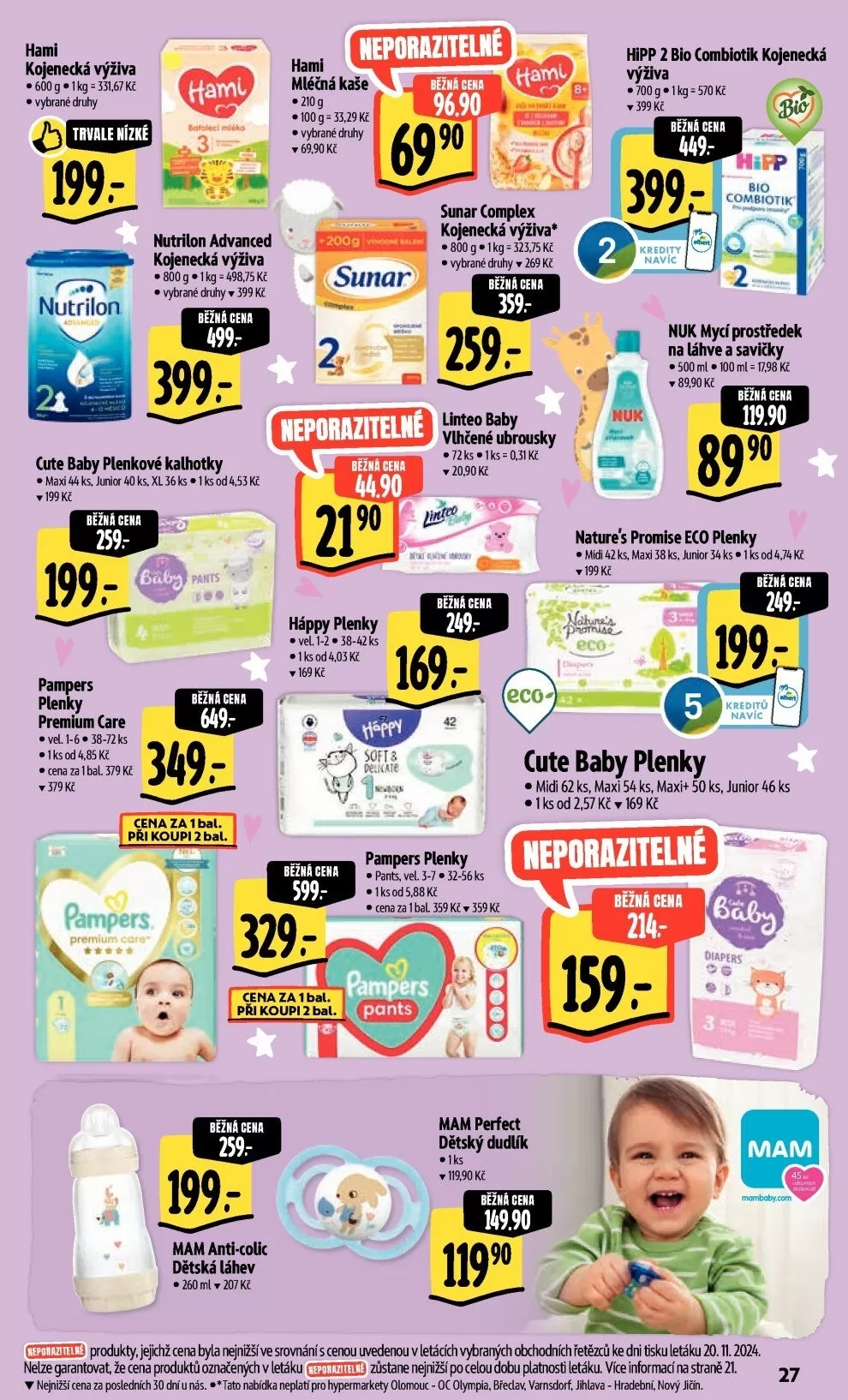 V letáku obchodu Albert najdete širokou nabídku kojenecké výživy a potřeb pro děti. Mezi vybranými produkty se objevují značky jako Hami, Hipp, Sunar a Nutrilon, které nabízejí kvalitní mléčné kaše a kojeneckou výživu. Například Hami mléčná kaše je k dostání za 96,90 Kč a Hipp 2 bio combiotik za 399 Kč.