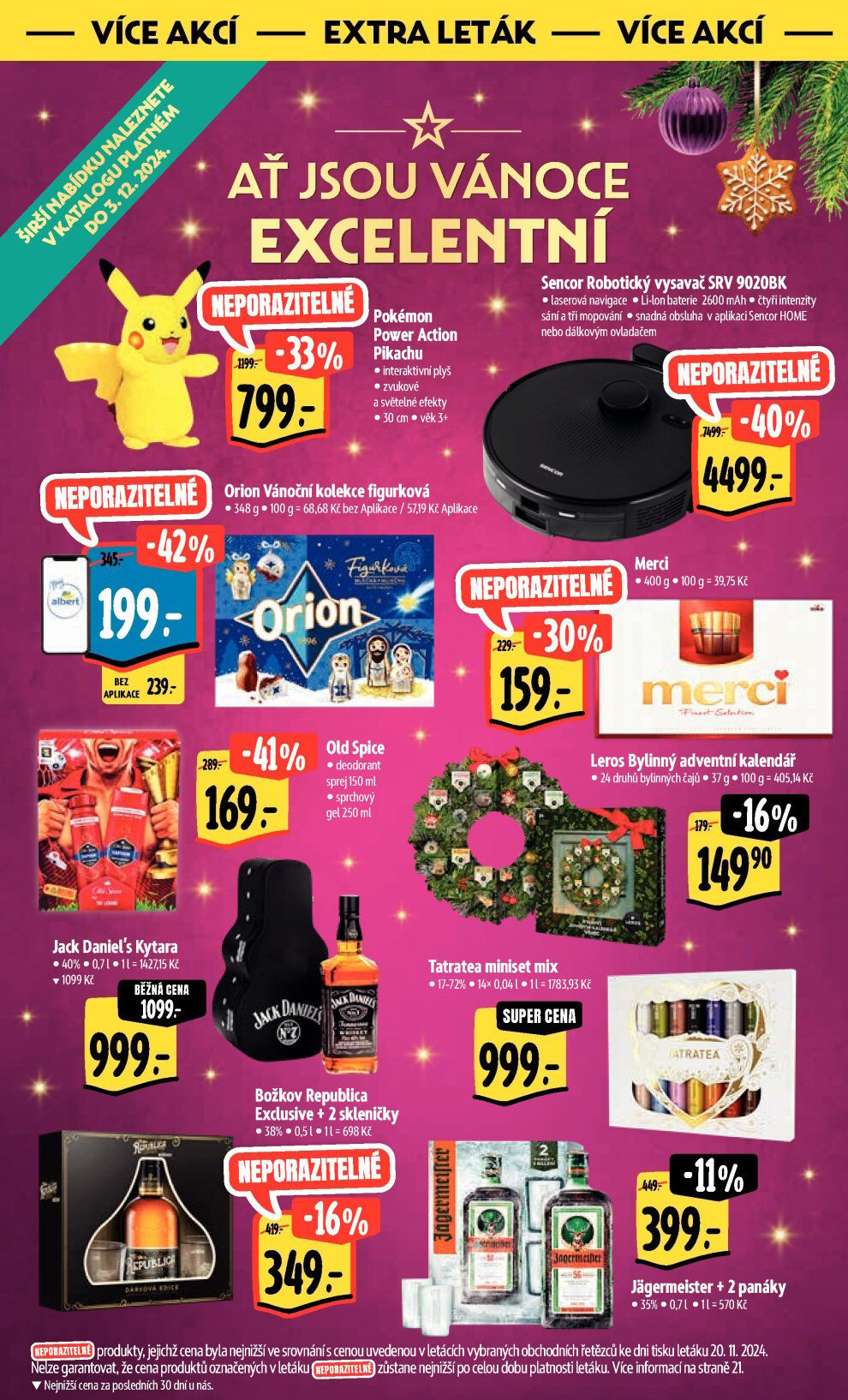 V letáku obchodu Albert najdete širokou nabídku vánočních produktů a akcí. Mezi nejzajímavější patří interaktivní plyšový Pikachu s zvukovými a světelnými efekty za 799 Kč. Dále si můžete pořídit robotický vysavač Sencor SRV 9020BK s laserovou navigací a snadnou obsluhou za 10 999 Kč.