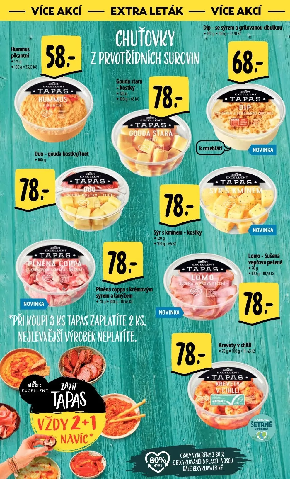 V letáku obchodu Albert najdete širokou nabídku produktů za akční ceny. Mezi novinkami se objevují pikantní humus a různé druhy sýrových kostek, jako je gouda a gouda star. Nechybí ani chutné dipy, například se sýrem a grilovanou bulkou. Pro milovníky tapas jsou k dispozici delikatesy jako sušená vepřová pečeně a plněná coppa s krémovým sýrem a lanýžem. A nezapomeňte na krevety v chilli, které jsou nyní za skvělou cenu. Všechny produkty jsou šetrné k životnímu prostředí, balené v recyklovatelném plastu. Navštivte Albert a objevte tyto skvělé nabídky!