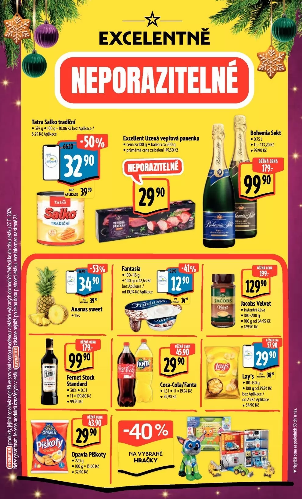 V letáku obchodu Albert najdete širokou nabídku produktů za skvělé ceny. Mezi nimi se objevuje tradiční Tatra Salko o hmotnosti 397 g za 8,29 Kč. Dále si můžete vychutnat uzenou vepřovou pandu, průměrná cena za balení cca 500 g je 149,50 Kč. Pro milovníky sladkostí jsou k dispozici piškoty Opavia v balení 220 g za 32,90 Kč. Nezapomeňte také na osvěžující nápoje Coca-Cola a Fanta, které jsou nyní na vybrané hračky. Pro milovníky kávy je tu Jacobs Velvet instantní káva o hmotnosti 180-200 g za 64,95 Kč. A pro příjemné chvíle s přáteli doporučujeme Bohemia sekt za 99,90 Kč. Navštivte Albert a objevte další skvělé nabídky!