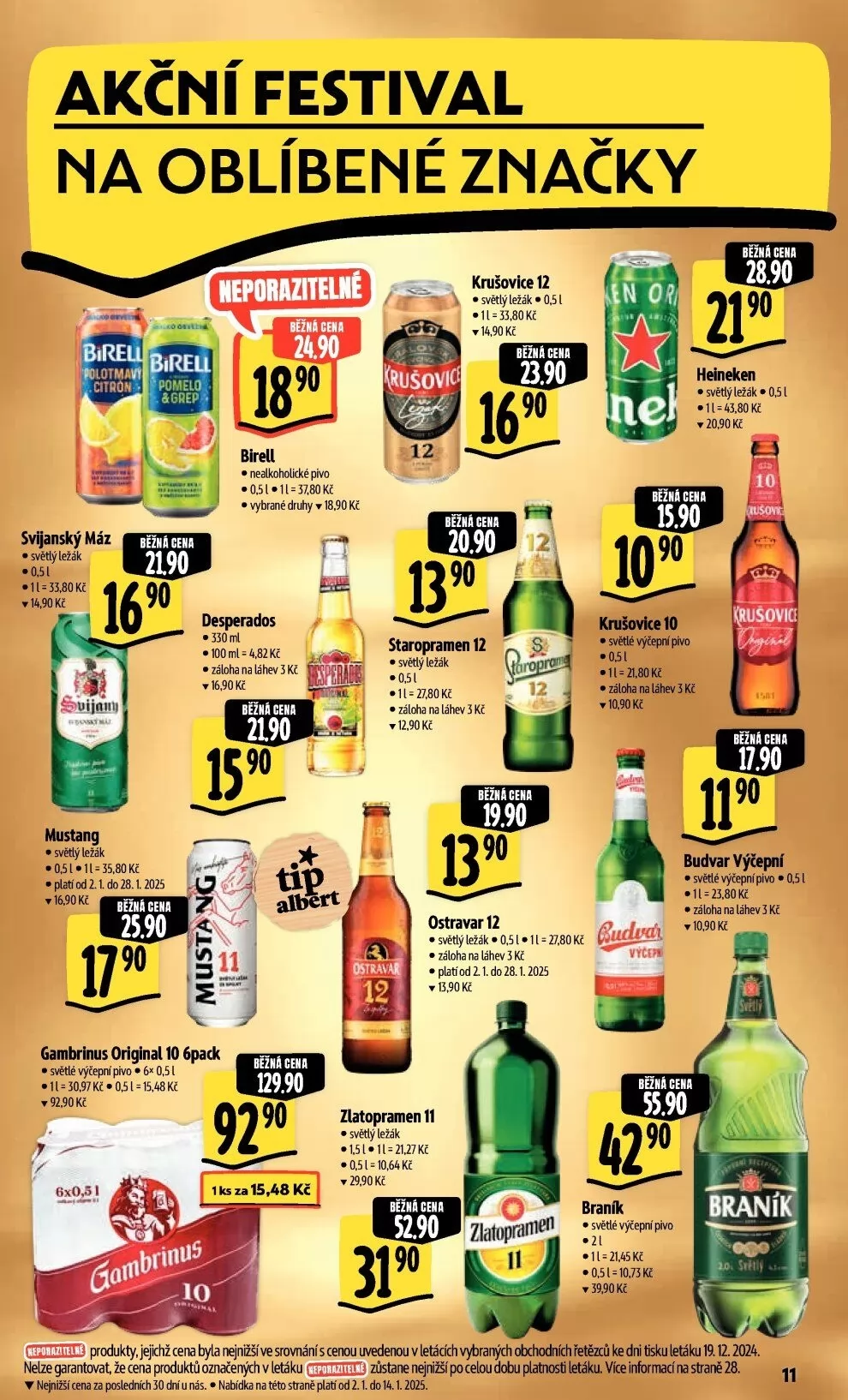 V letáku obchodu Albert najdete akční festival na oblíbené značky piva. Mezi nabízenými produkty se objevují světlé ležáky jako Krušovice 12 za 28,90 Kč, Heineken za 21,90 Kč a Svijanský máz za 17,90 Kč. Nechybí ani nealkoholické pivo za 18,90 Kč a další varianty jako Staropramen 12 za 23,90 Kč a Zlatopramen 11 za 29,90 Kč. Akce platí od 2.1. do 14.1.2025, takže neváhejte a využijte skvělé ceny na vybrané druhy piva!