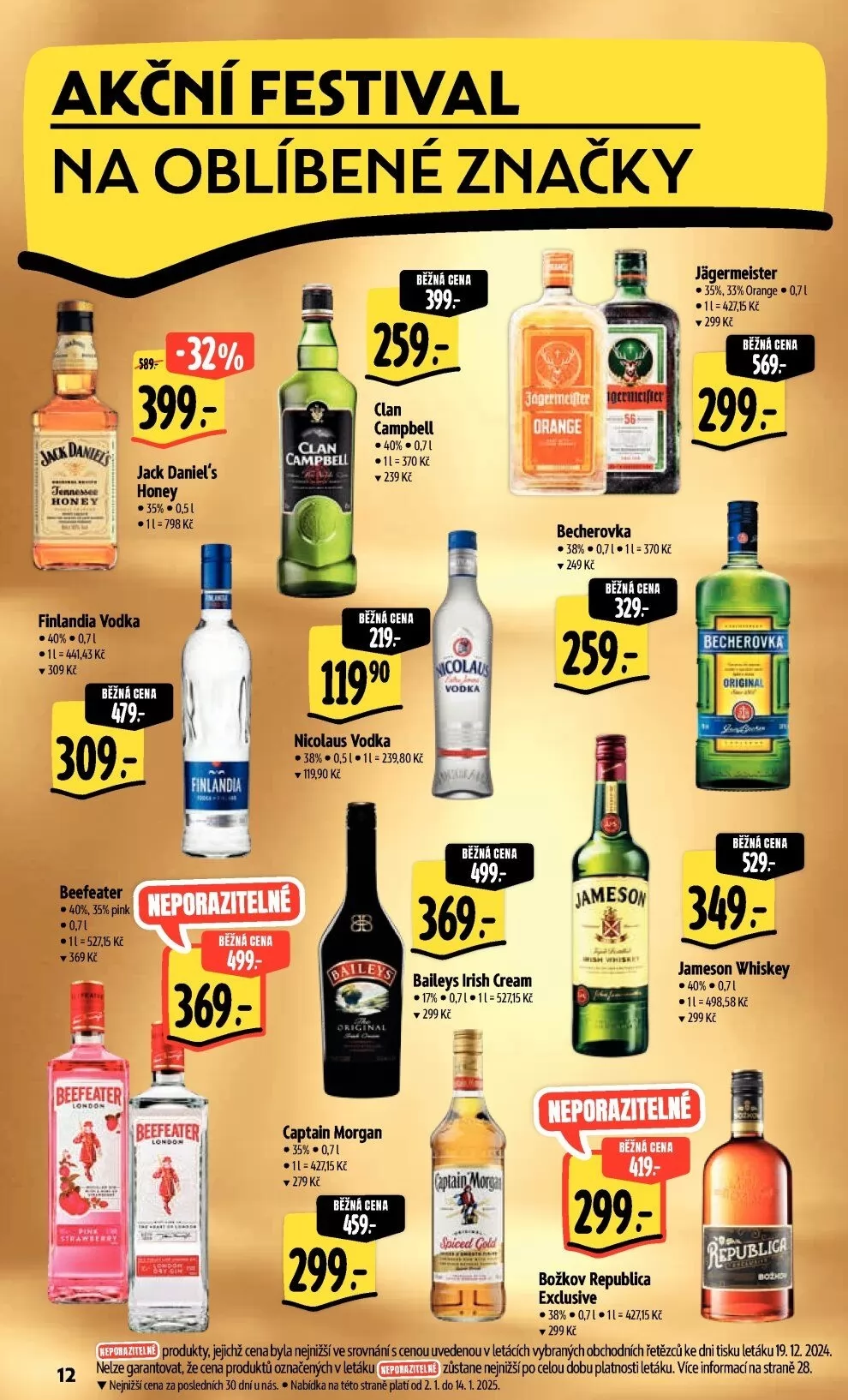 V letáku obchodu Albert najdete skvělé akční nabídky na oblíbené značky. Mezi nejzajímavější produkty patří Jack Daniel's Honey za 259 Kč, Becherovka za 249 Kč a Finlandia vodka za 309 Kč. Nezapomeňte také na Jameson whiskey a Baileys Irish Cream, které jsou k dostání za 299 Kč. Akce platí od 2. 1. do 14. 1. 2025, takže neváhejte a využijte těchto skvělých cen!