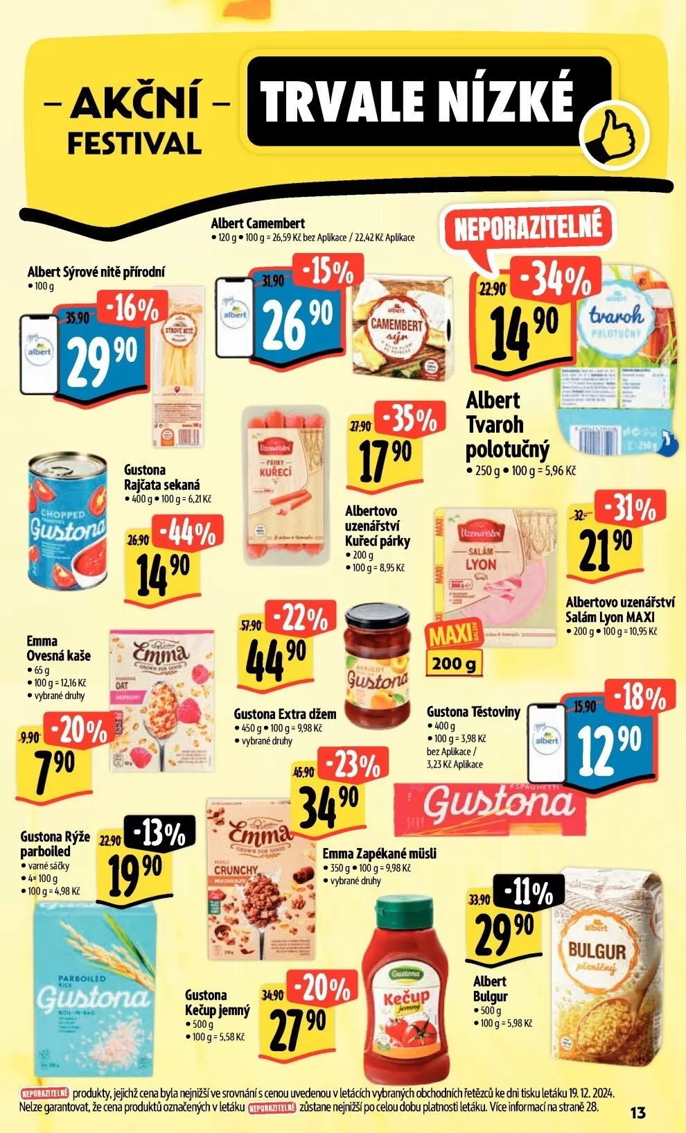 V letáku obchodu Albert najdete širokou nabídku akčních produktů. Mezi nimi se objevují sýrové nitě Albert, které jsou nyní za trvale nízkou cenu. Dále si můžete vychutnat camembert Albert o hmotnosti 120 g, který je k dispozici za 22,42 Kč s aplikací.