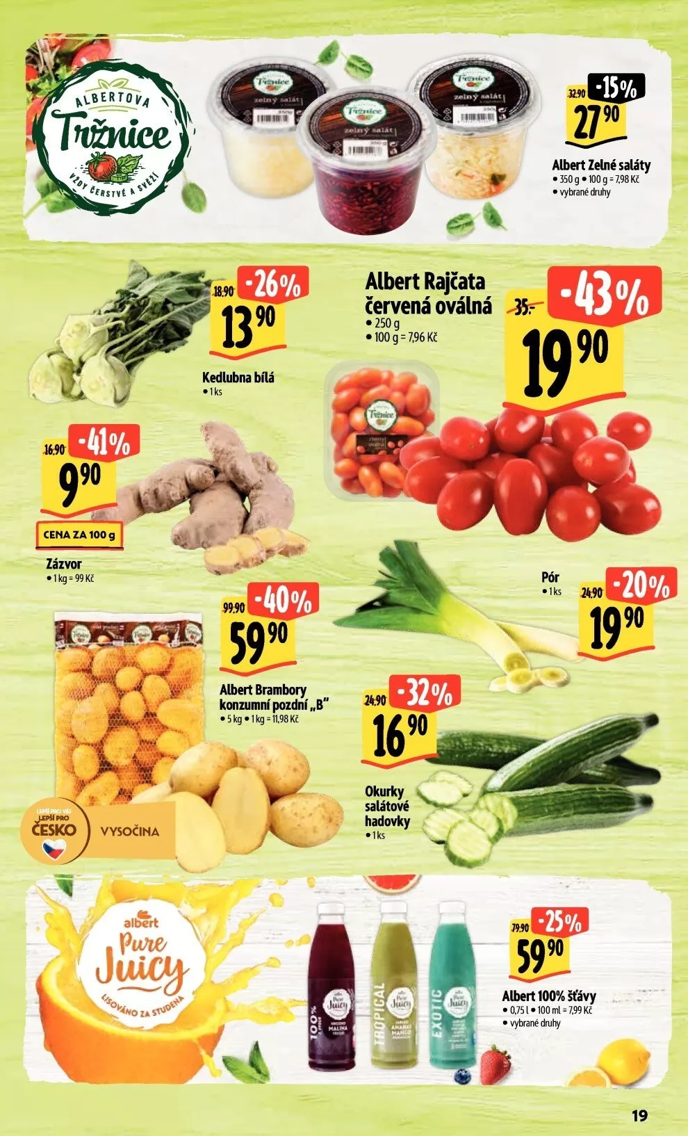 V letáku obchodu Albert najdete širokou nabídku čerstvých produktů. Mezi nimi jsou například zelné saláty o hmotnosti 350 g za cenu 7,98 Kč za 100 g. Dále si můžete pořídit zázvor za 99 Kč za 1 kg.