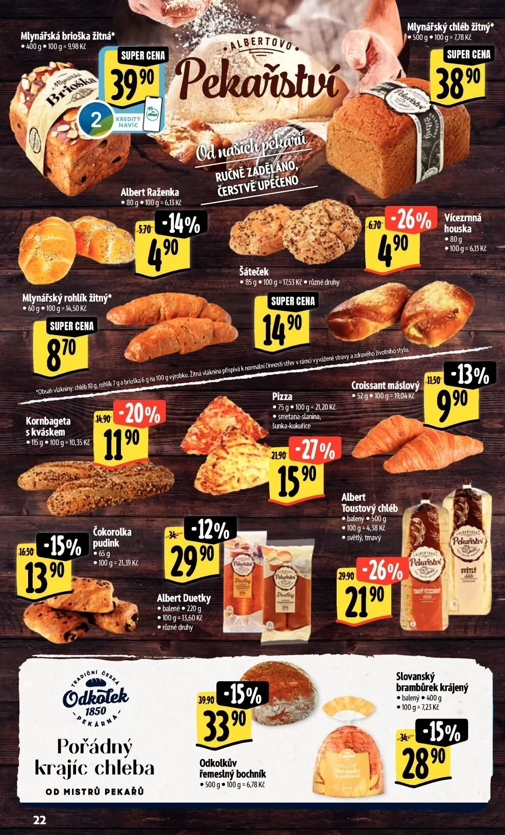 V letáku obchodu Albert najdete širokou nabídku kvalitních pekárenských výrobků. Mezi nimi se vyjímají mlynářský chléb žitný a mlynářská brioška žitná, které jsou k dostání za super cenu. Nezapomeňte také na mlynářský rohlík žitný a kornbagetu s kváskem, ideální pro každodenní snídani.