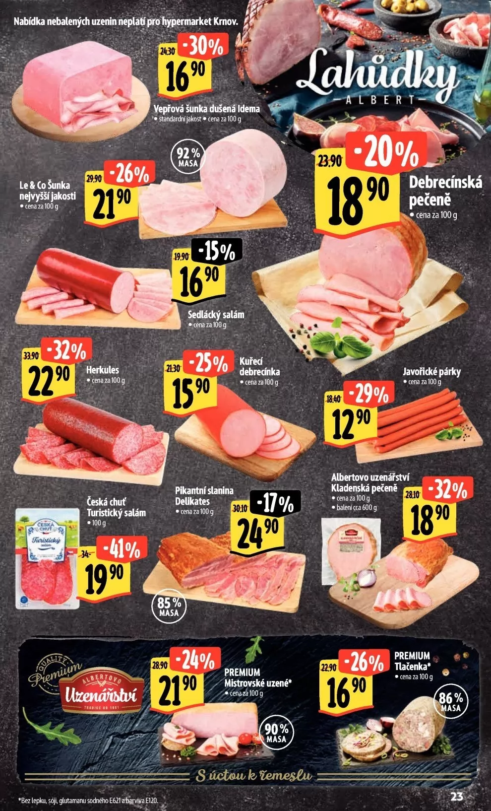 V letáku obchodu Albert najdete širokou nabídku kvalitních masných výrobků. Mezi nimi se nachází le & co šunka nejvyšší jakosti, turistický salám a sedlácký salám, které potěší každého milovníka masa. Dále nabízíme kuřecí debrecínku, pikantní slaninu a mistrovské uzené, které jsou ideální pro každou příležitost. Nezapomeňte také na debrecínskou pečeně a javořické párky, které jsou skvělou volbou pro rychlé občerstvení. Kladenská pečeně a premium tlačenka jsou dalšími lahůdkami, které si můžete dopřát. Všechny produkty jsou pečlivě vybrány a nabízeny za výhodné ceny za 100 g.