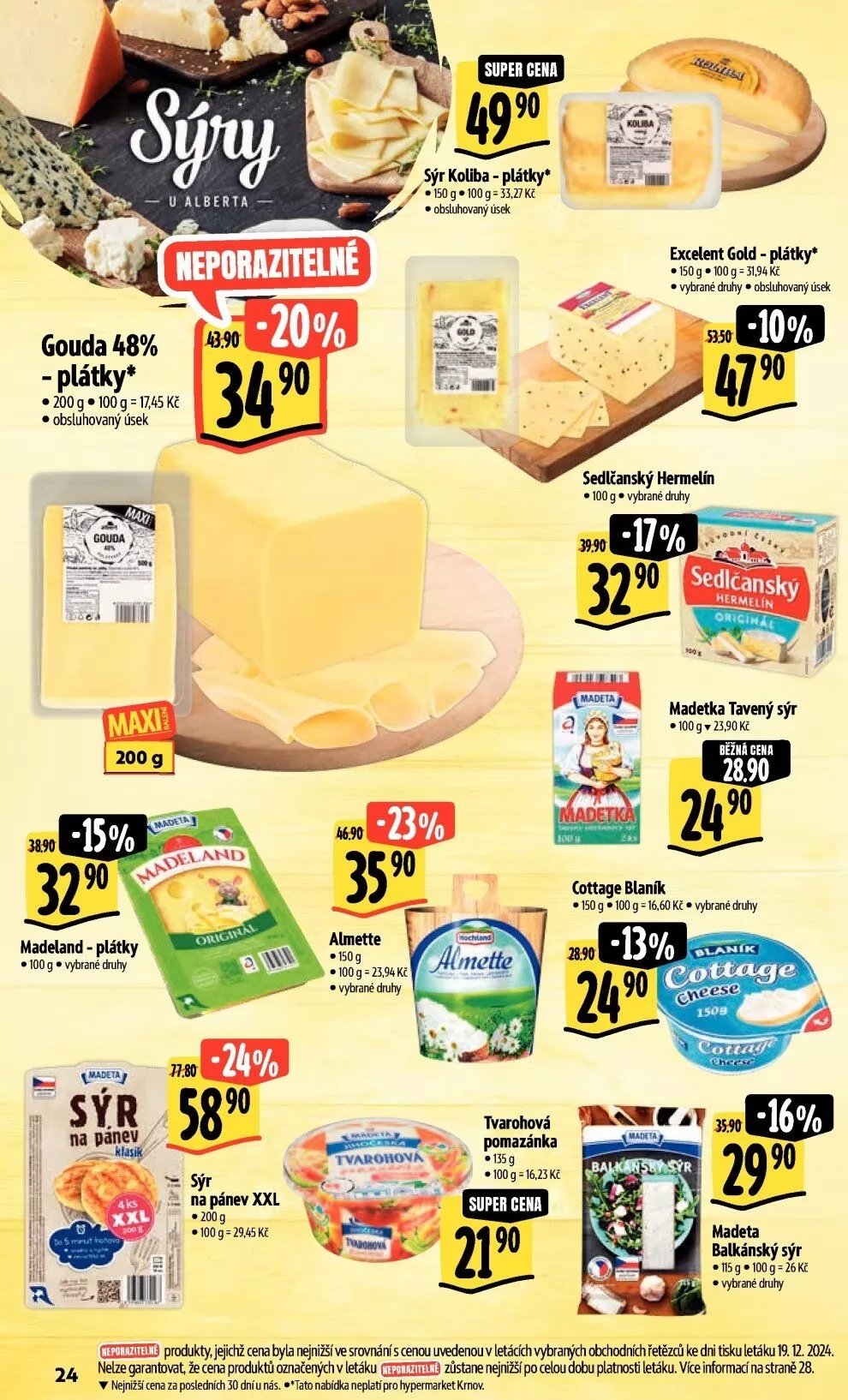 Mezi dalšími produkty se objevují tavené sýry Madetka a cottage sýr Blaník, které jsou k dostání za výhodné ceny. Nezapomeňte, že ceny uvedené v letáku mohou být nejnižší ve srovnání s jinými obchody, ale nelze zaručit, že zůstanou stejné po celou dobu platnosti letáku. Pro více informací se podívejte na stranu 28.