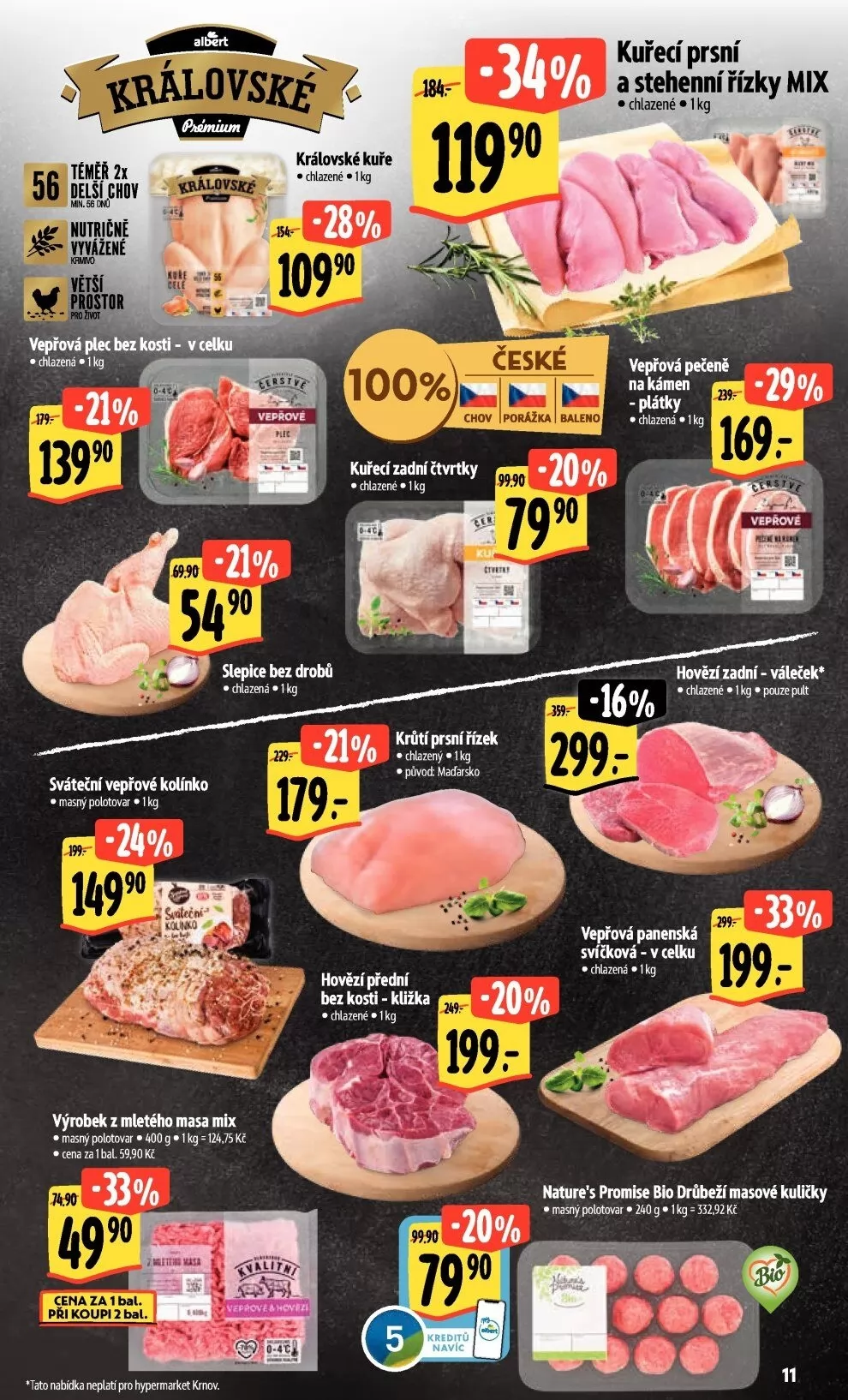 V letáku obchodu Albert najdete širokou nabídku kvalitních chlazených mas. Mezi hlavními produkty se objevují královské kuře za 119,90 Kč/kg, vepřová plec bez kosti za 139,90 Kč/kg a kuřecí prsní a stehenní řízky mix za 109,90 Kč/kg. Dále si můžete pořídit vepřovou pečeně na kámen v plátcích, kuřecí zadní čtvrtky za 99,90 Kč/kg a sváteční vepřové kolínko jako masný polotovar za 149,90 Kč/kg.