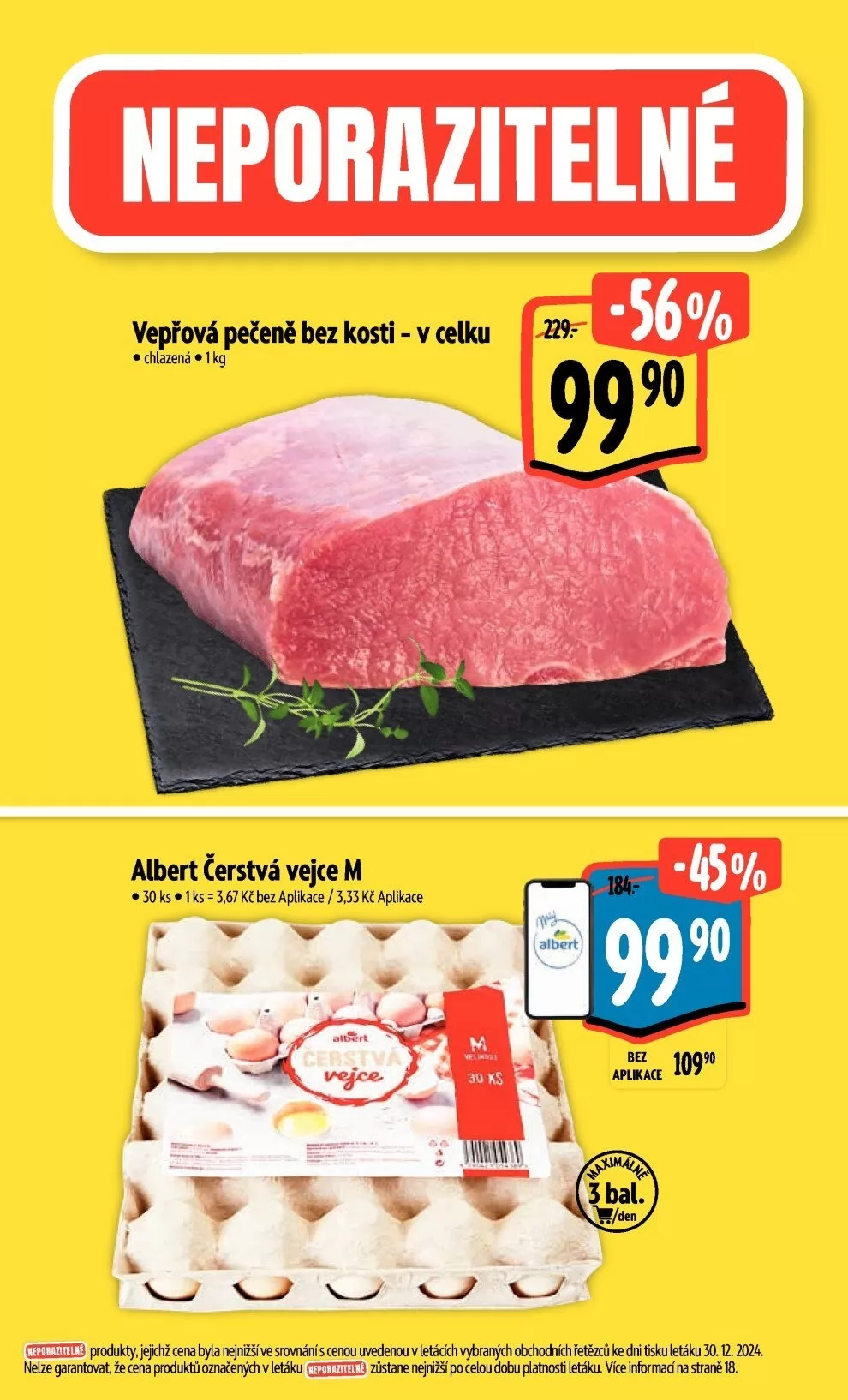 V letáku obchodu Albert najdete skvělé nabídky na vepřovou pečeně bez kosti, která je dostupná v celku a chlazená, s hmotností 1 kg. Dále si můžete pořídit čerstvá vejce Albert, která jsou balena po 30 ks. Cena za jedno vejce je 3,67 Kč bez aplikace a 3,33 Kč s aplikací. Nezapomeňte, že ceny produktů mohou být nižší v porovnání s jinými obchodními řetězci, ale nelze garantovat, že zůstanou nejnižší po celou dobu platnosti letáku. Pro více informací se podívejte na stranu 18.