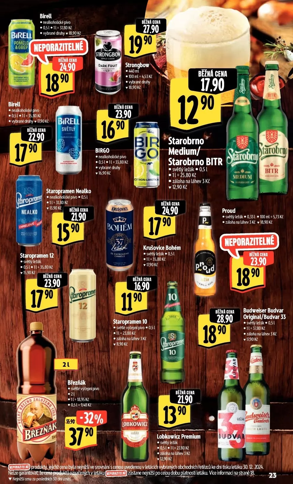 V letáku obchodu Albert najdete širokou nabídku piva a nealkoholických nápojů. Mezi vybranými druhy piva se objevují značky jako Birell, Starobrno, Staropramen a Budweiser Budvar. Ceny se pohybují od 12,90 Kč za nealkoholické pivo až po 27,90 Kč za vybrané světlé ležáky. Nezapomeňte také na zálohu na láhev, která činí 3 Kč. Pro milovníky nealkoholických variant je k dispozici široký výběr, včetně Staropramen nealko a dalších značek. Využijte skvělé ceny a vyberte si své oblíbené pivo!