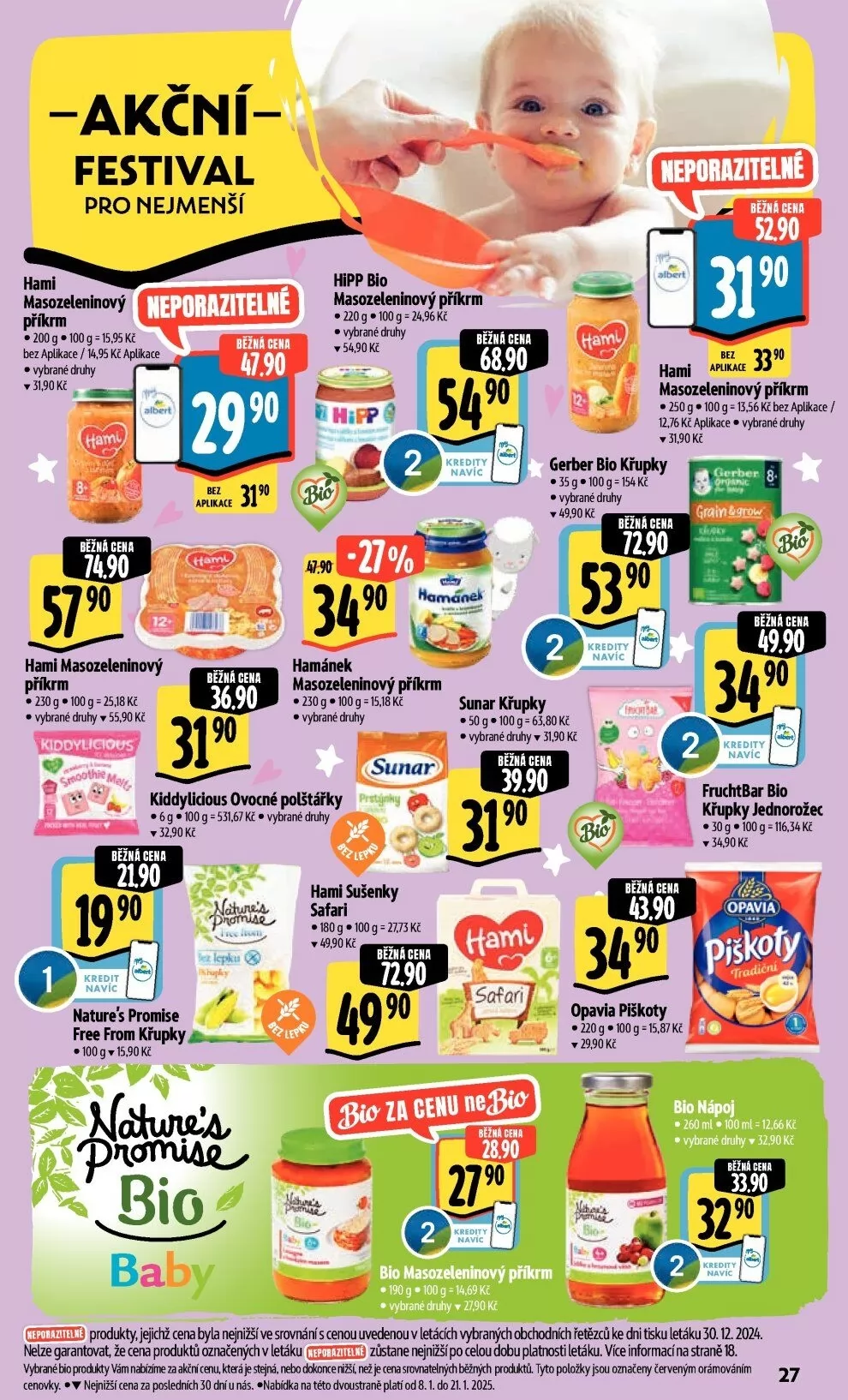 V letáku obchodu Albert najdete širokou nabídku produktů pro nejmenší. Mezi akčními položkami se objevují masozeleninové příkrmy značek Hami, Hipp a Sunar, které jsou k dispozici za výhodné ceny. Například Hami masozeleninový příkrm 250 g je za 31,90 Kč, zatímco Hipp bio příkrm 220 g můžete pořídit za 52,90 Kč.