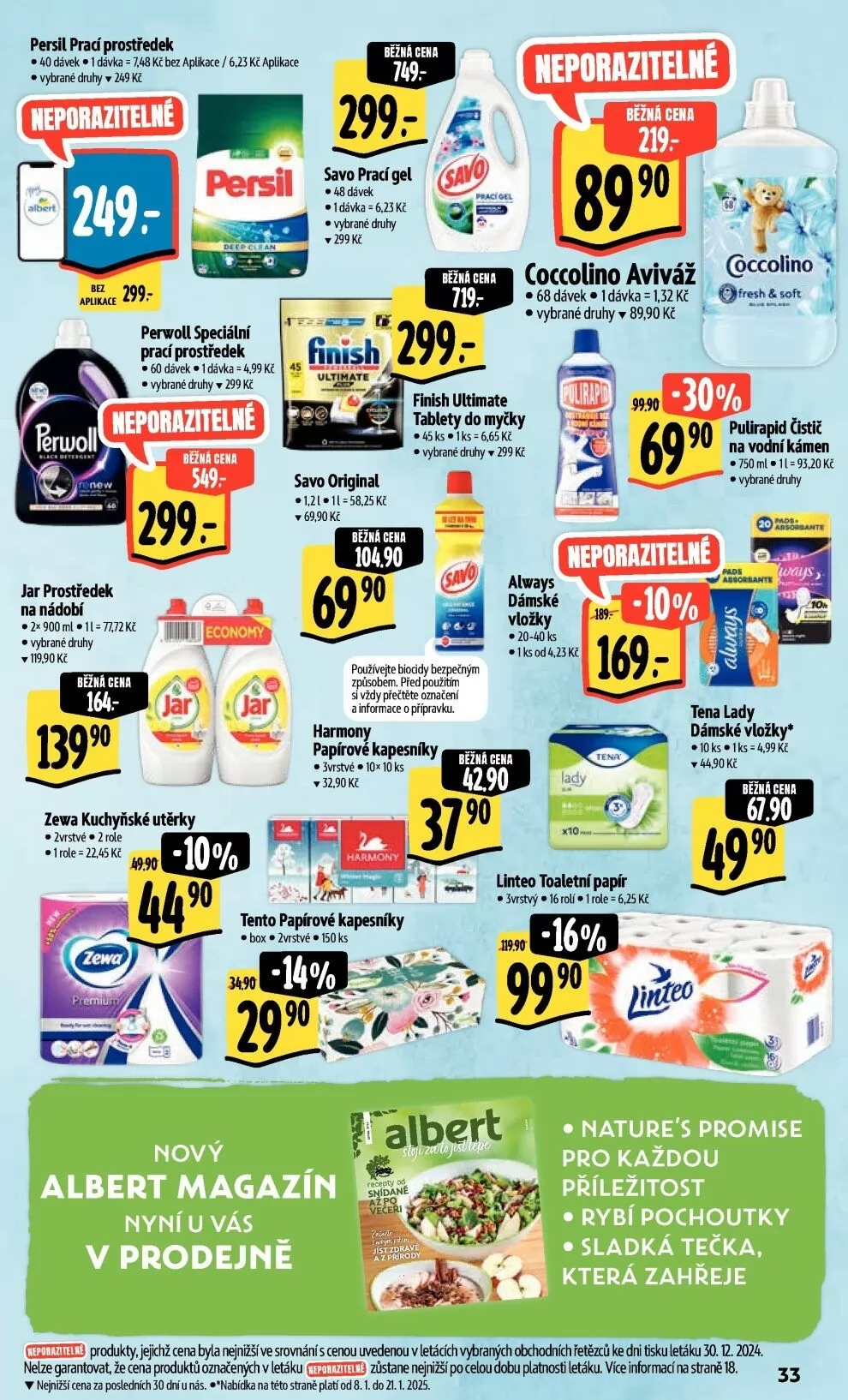 V letáku obchodu Albert najdete širokou nabídku kvalitních pracích a úklidových prostředků. Mezi nimi se vyjímá Persil prací prostředek s 40 dávkami za 249 Kč, nebo Perwoll speciální prací prostředek s 60 dávkami za 299 Kč. Pro mytí nádobí je k dispozici Jar prostředek na nádobí za 299 Kč.