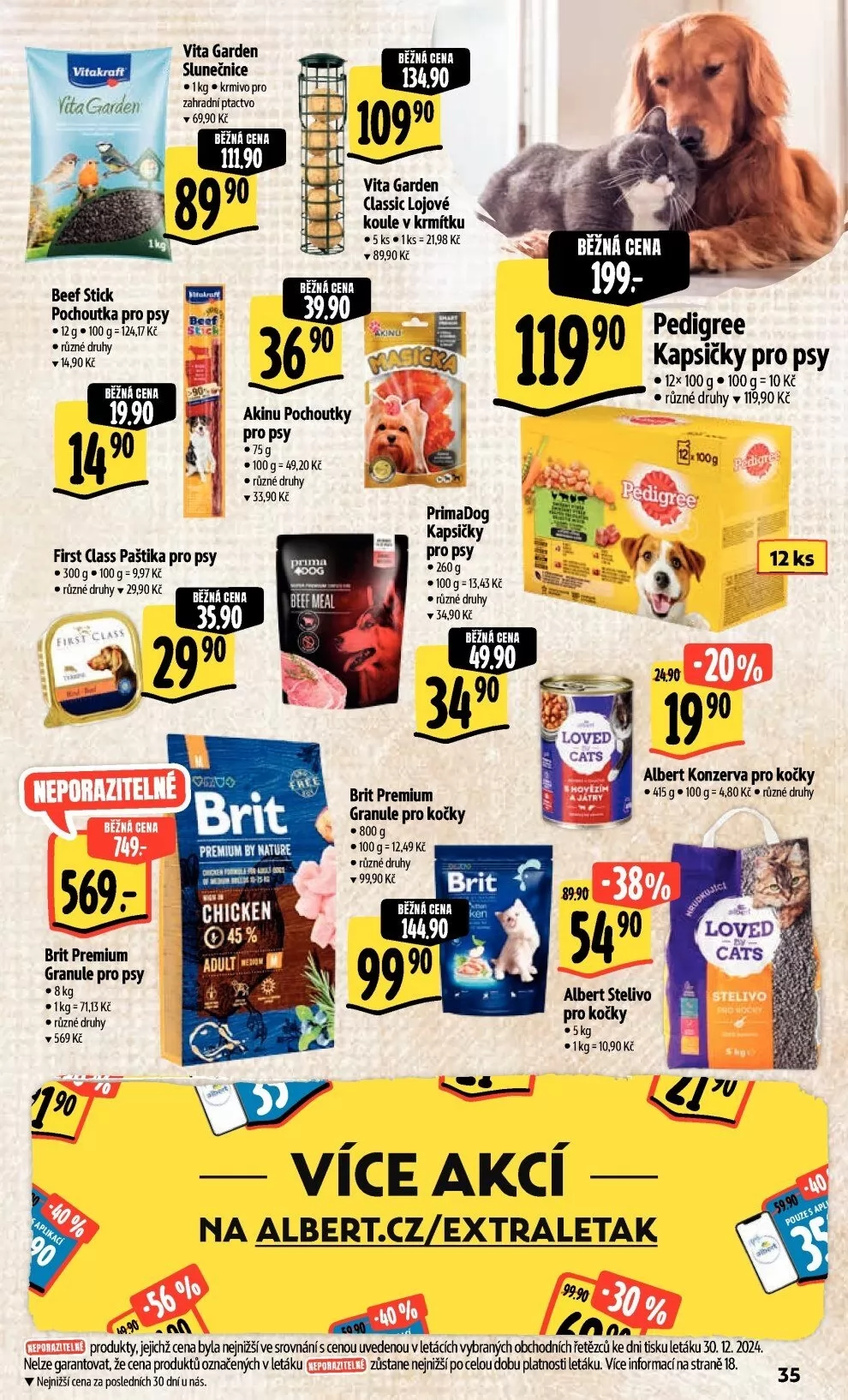 V letáku obchodu Albert najdete širokou nabídku produktů pro vaše domácí mazlíčky. Mezi nimi jsou krmné směsi pro ptactvo Vita Garden slunečnice, které jsou k dispozici v balení 1 kg. Pro psy si můžete vybrat z různých druhů pochoutek Beef Stick nebo kapsiček Primadog a Pedigree.