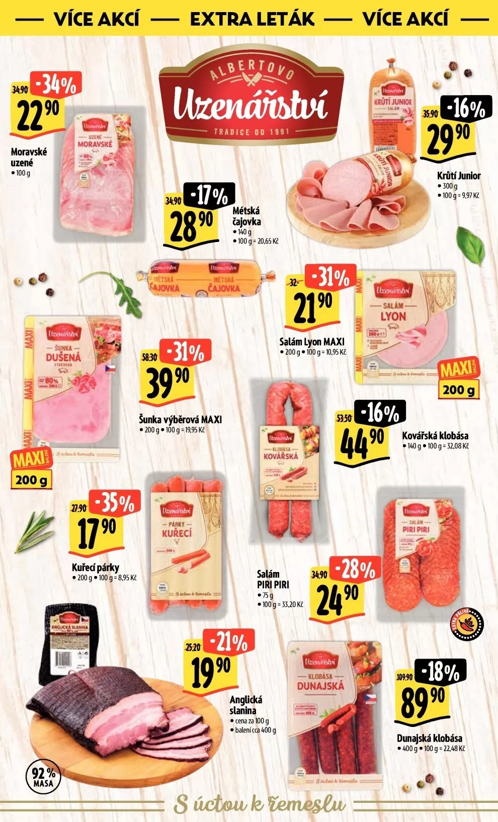V letáku obchodu Albert najdete skvělé akční nabídky na různé masné výrobky. Například moravské uzené za 20,65 Kč za 100 g nebo dušené kuřecí párky za 92 Kč za 200 g. Dále je v nabídce krůtí junior v balení 300 g za 29,90 Kč.