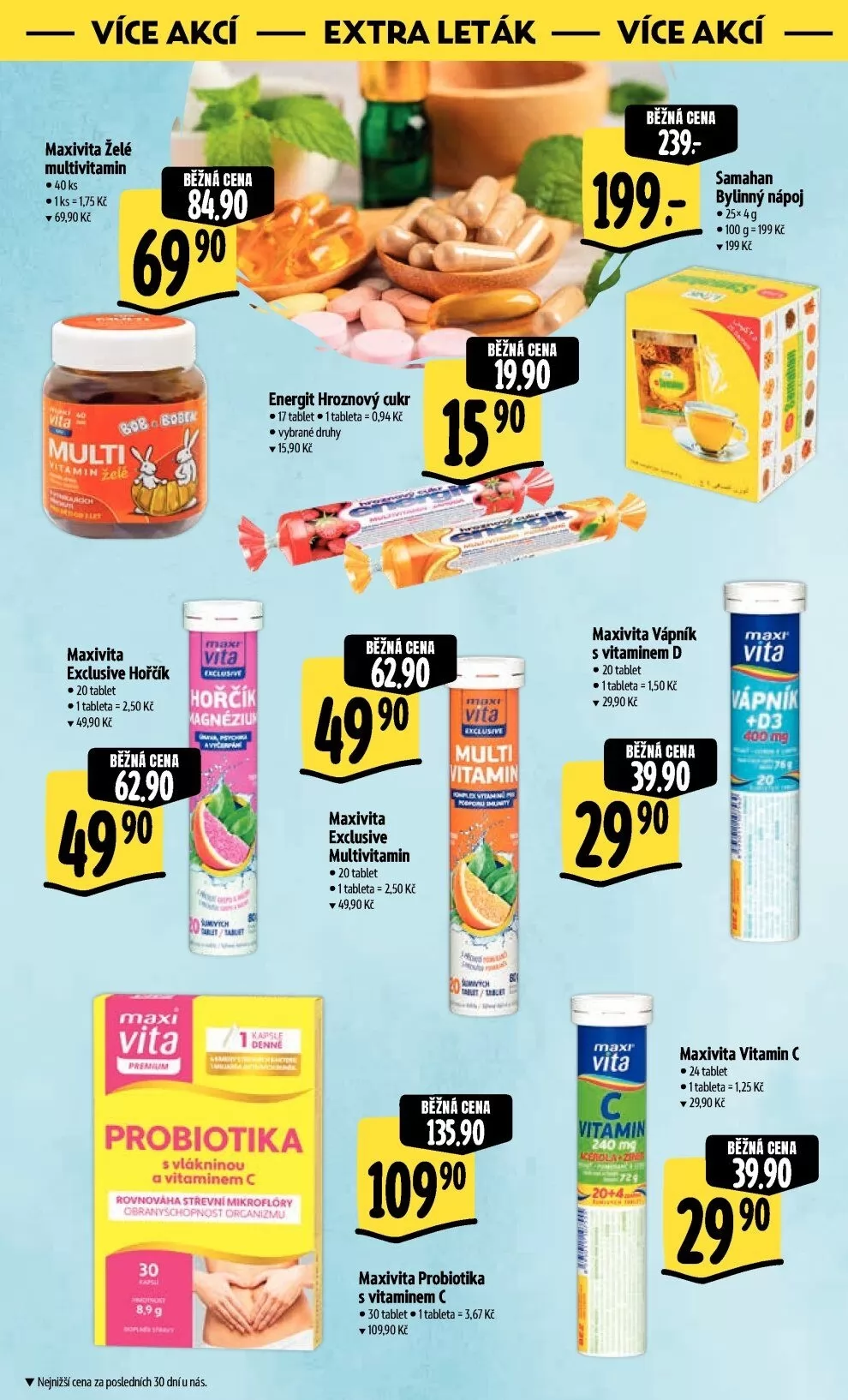 V letáku obchodu Albert najdete širokou nabídku produktů za akční ceny. Mezi nimi je Maxivita želé multivitamin s 40 kusy za 69,90 Kč. Dále nabízíme Maxivita exclusive hořčík, který obsahuje 20 tablet a cena za jednu tabletu je 2,50 Kč, celkově za 49,90 Kč.