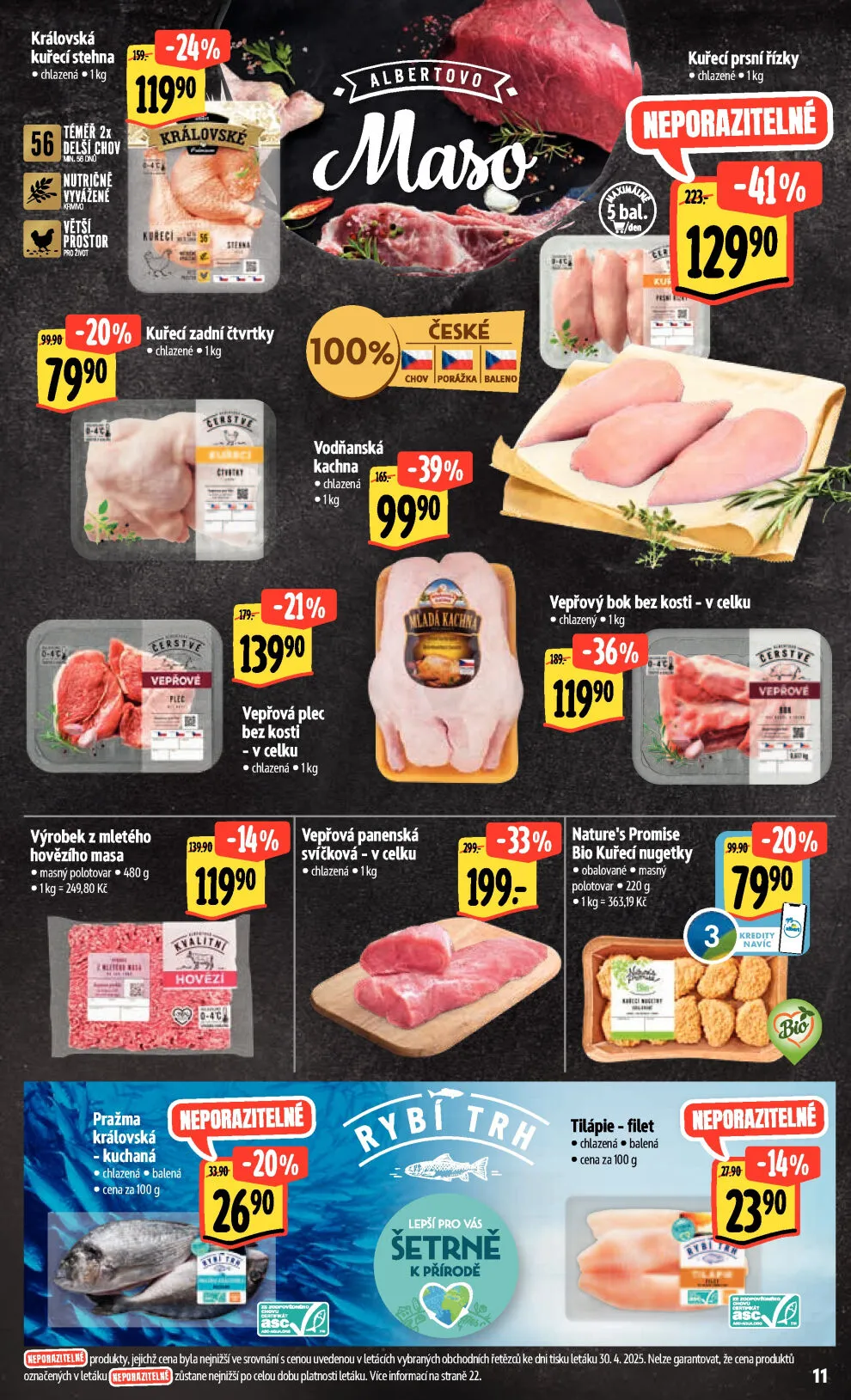 V letáku obchodu Albert najdete širokou nabídku kvalitních masných výrobků. Mezi nimi se objevují královská kuřecí stehna za 21 Kč za kilogram a chlazené kuřecí zadní čtvrtky za 79,90 Kč za kilogram. Dále si můžete vybrat vodňanskou kachnu za 139,90 Kč za kilogram nebo vepřovou plec bez kosti v celku za 99,90 Kč za kilogram.