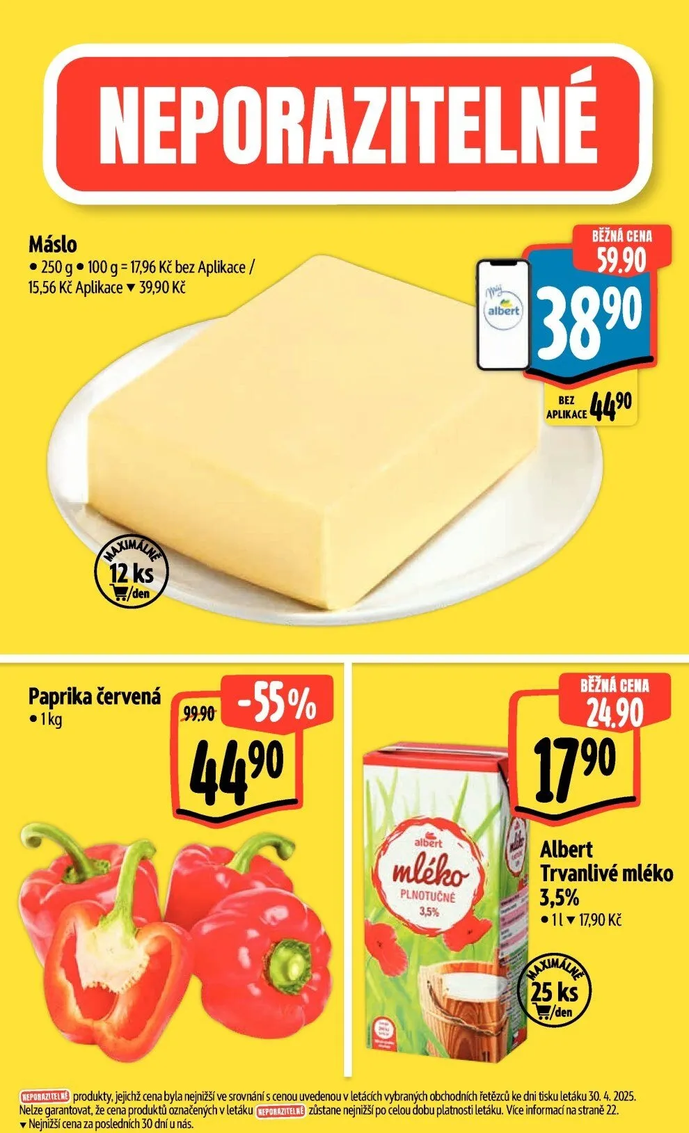 V letáku obchodu Albert najdete skvělé nabídky na různé produkty. Například máslo o hmotnosti 250 g je k dispozici za cenu 39,90 Kč, přičemž cena bez aplikace činí 17,96 Kč za 100 g. Červená paprika je nabízena za 59,90 Kč za kilogram. Dále můžete zakoupit plnotučné trvanlivé mléko za 17,90 Kč. Nezapomeňte, že ceny uvedené v letáku jsou nejnižší ve srovnání s jinými obchodními řetězci k datu 30.4.2025, avšak nelze garantovat, že zůstanou nejnižší po celou dobu platnosti letáku. Pro více informací se podívejte na stranu 22.