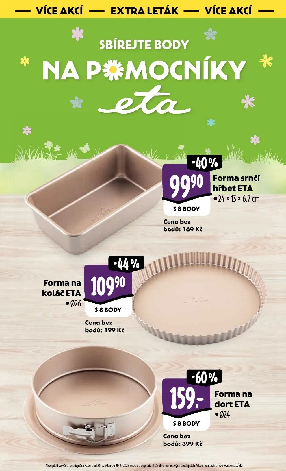 V letáku obchodu Albert najdete skvělé akce na produkty značky Eta. Můžete si pořídit formu na srnčí hřbet za cenu 169 Kč, pokud máte 8 bodů. Dále je v nabídce forma na koláč za 199 Kč a forma na dort za 399 Kč, obě s možností sbírat body. Akce platí ve všech prodejnách Albert od 26.3.2025 do 20.1.2025 nebo do vyprodání zásob. Nezapomeňte využít této skvělé příležitosti!