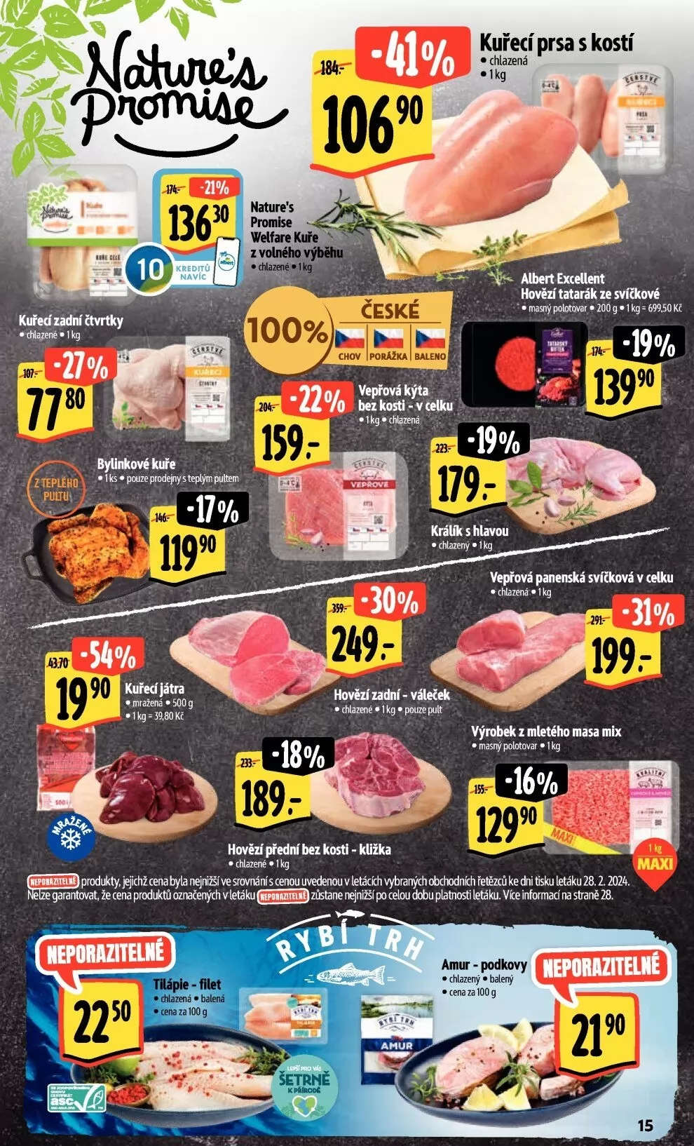 prodlkty, bichž cena byla nejnižšíve srwnání s cenou uvedenou v letácích vybraných ódi)dních řetězců ke dni tisku letáku 28.2.2024.