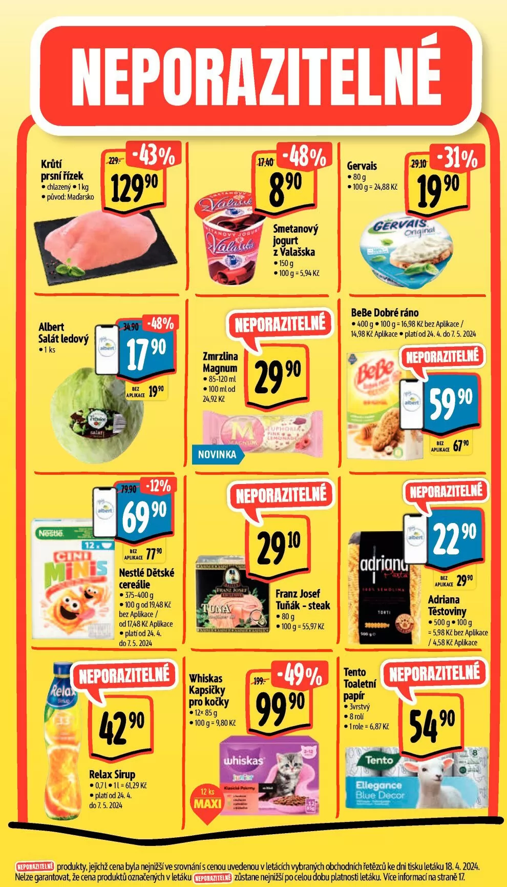 produkty, jejichž cena byla nejnižšíve srovnání s cemu uvedernu v letácích vybraných obchodních řetězců ke dni tisku letáku 18.4.2024.