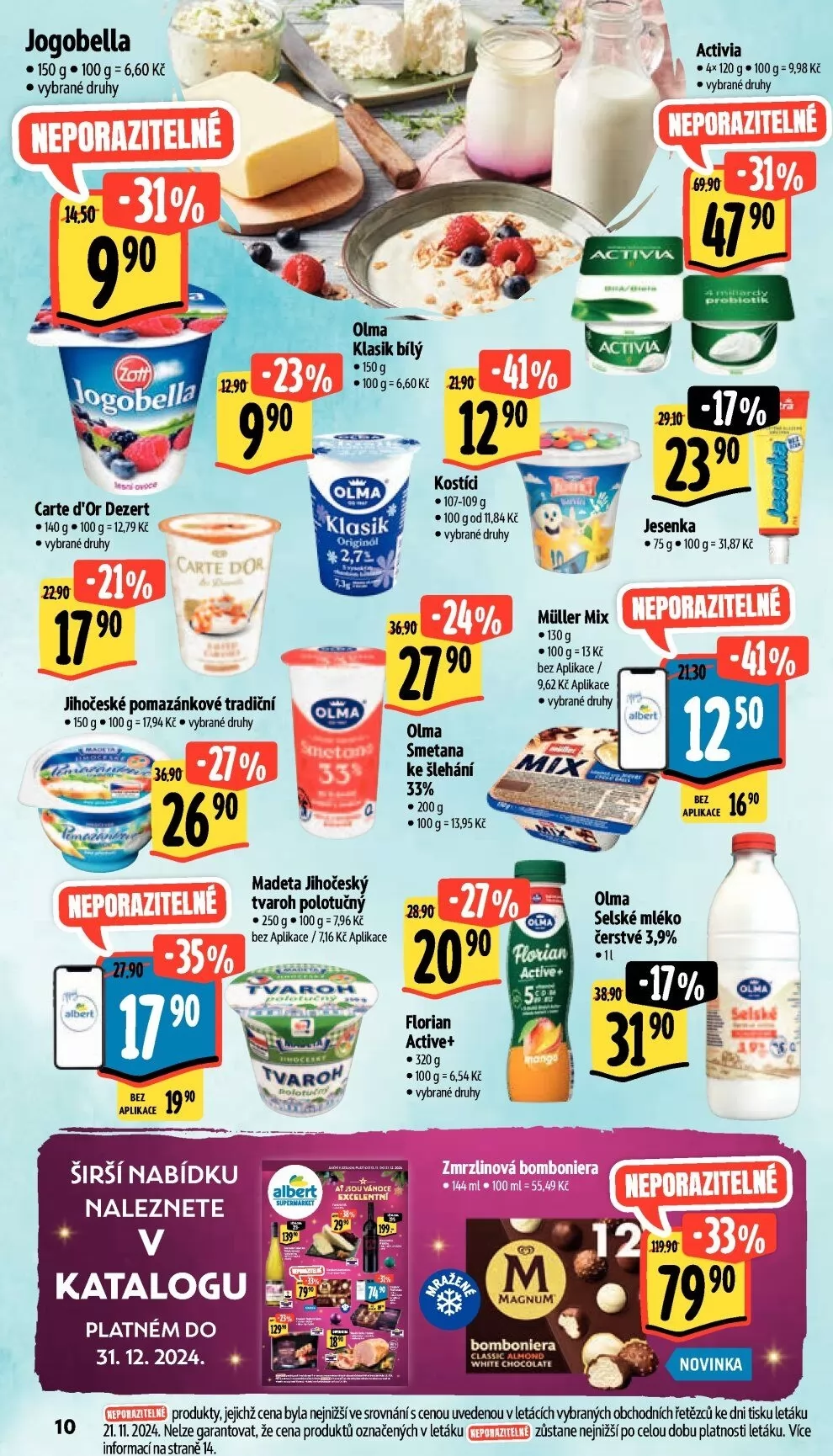 V letáku obchodu Albert najdete širokou nabídku mléčných výrobků, které potěší každého milovníka kvalitních potravin. Mezi nejoblíbenější patří jogurty Jogobella a Activia, které jsou k dispozici ve vybraných druzích. Dále si můžete vybrat z klasického bílého tvarohu Olma nebo smetany ke šlehání.