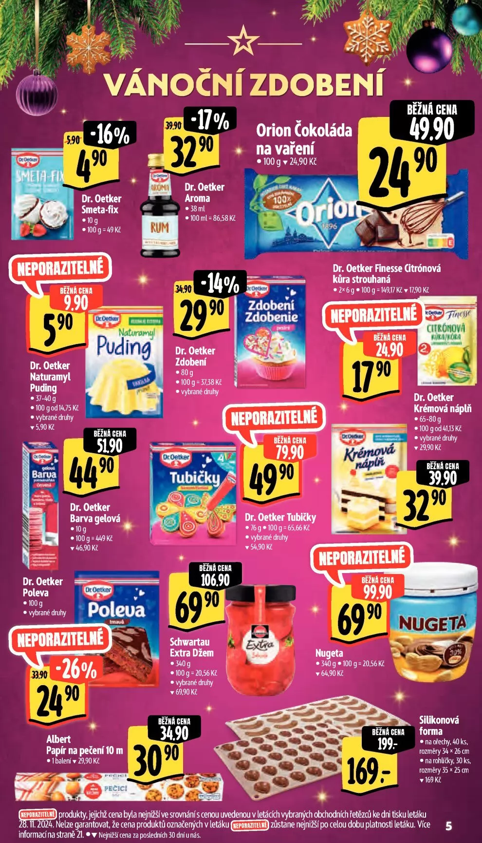 V letáku obchodu Albert najdete širokou nabídku vánočního zdobení a cukrářských potřeb. Mezi produkty se objevují čokolády na vaření od značky Orion za 24,90 Kč, smeta•fix od Dr. Oetkera za 49 Kč, a různé tubičky na zdobení za ceny od 54,90 Kč.
