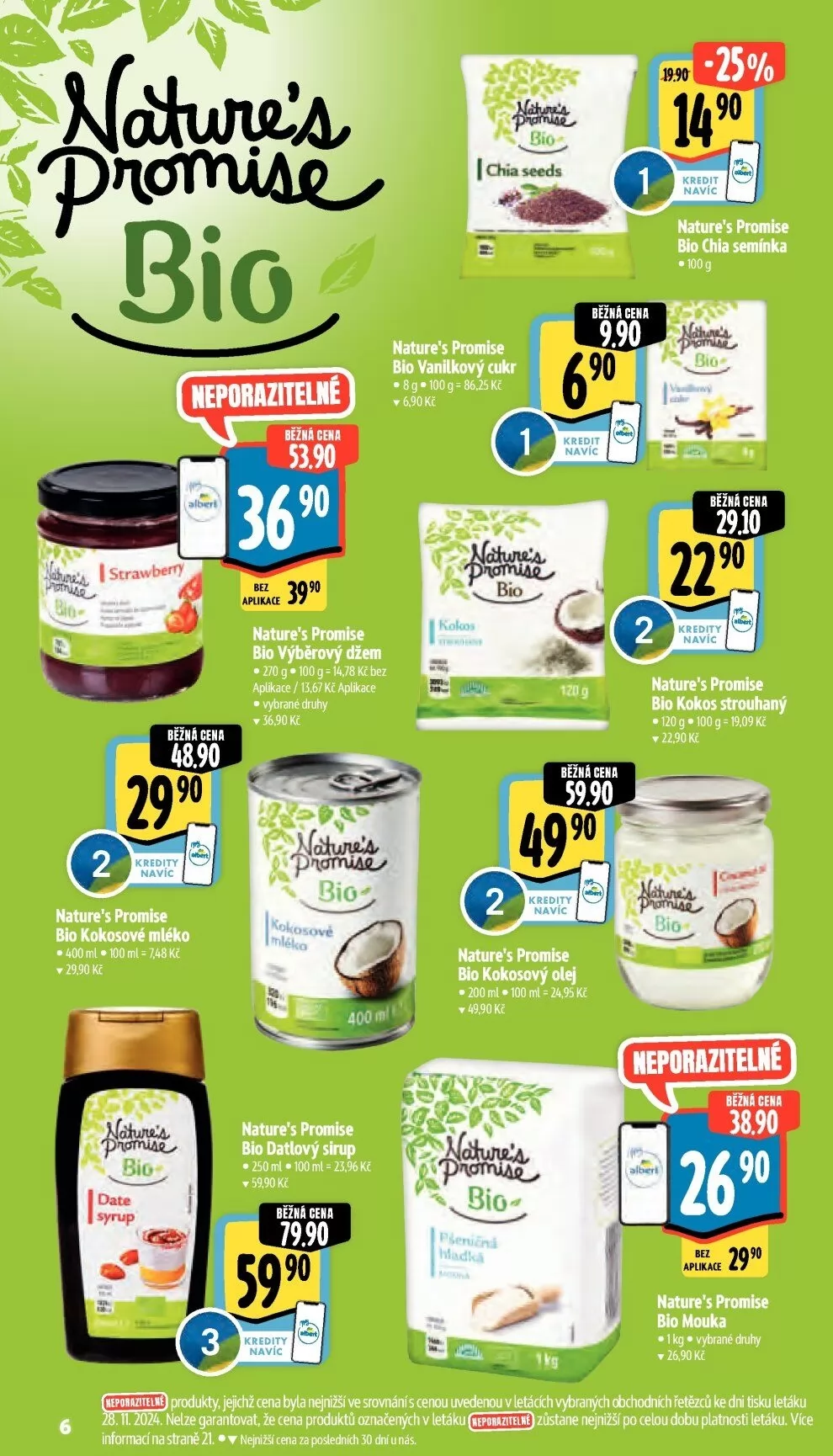 V letáku obchodu Albert najdete širokou nabídku bio produktů značky Nature's Promise. Mezi nimi se objevují bio vanilkový cukr za 69,00 Kč, bio chia semínka za 29,10 Kč a bio kokosové mléko za 36,90 Kč. Dále si můžete pořídit bio výběrový džem za 14,78 Kč na 100 g a bio datlový sirup za 79,90 Kč. Nezapomeňte také na bio kokosový olej za 49,90 Kč a strouhaný kokos za 22,90 Kč. Všechny produkty jsou pečlivě vybrané a jejich ceny byly porovnány s jinými obchody, abyste měli jistotu, že nakupujete výhodně.