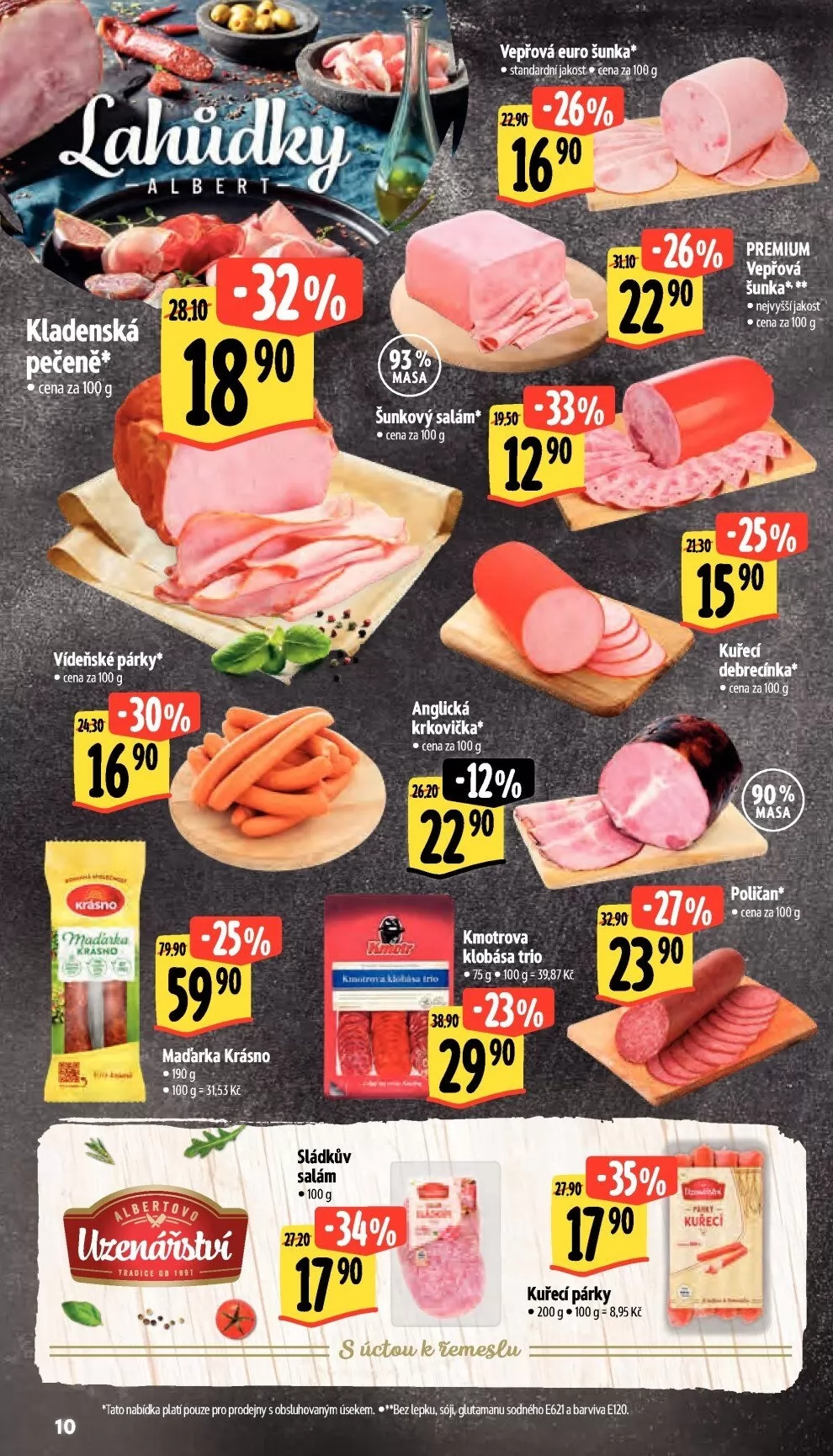 V letáku obchodu Albert najdete širokou nabídku masných výrobků. Mezi nimi se objevují kladenská pečeně, vídeňské párky a šunkový salám, které jsou cenově dostupné. Dále si můžete vybrat anglickou krkovičku a klobásu trio, které jsou skvělou volbou pro každou příležitost. Nezapomeňte také na kuřecí párky a vepřovou euro šunku, které jsou nabízeny v různých gramážích. Všechny produkty jsou kvalitní a cenově výhodné, ideální pro vaši domácnost.