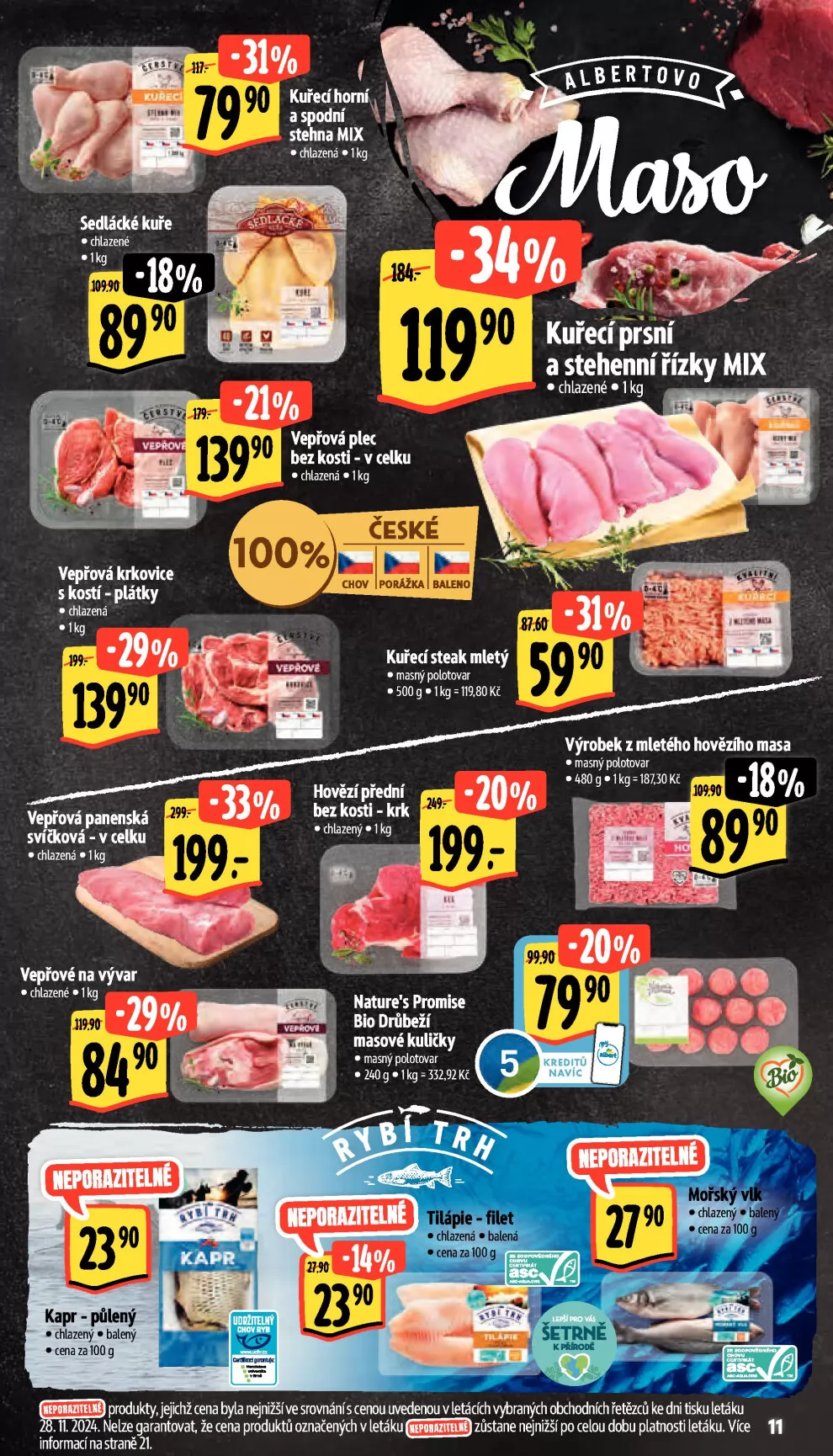 V letáku obchodu Albert najdete širokou nabídku kvalitních masných výrobků. Mezi nimi se objevují sedlácké kuře, vepřová krkovice s kostí, kuřecí stehna mix a vepřová plec bez kosti. Dále si můžete vybrat z nabídky kuřecího steaku mletého, vepřové panenské svíčkové a vepřového masa na vývar.