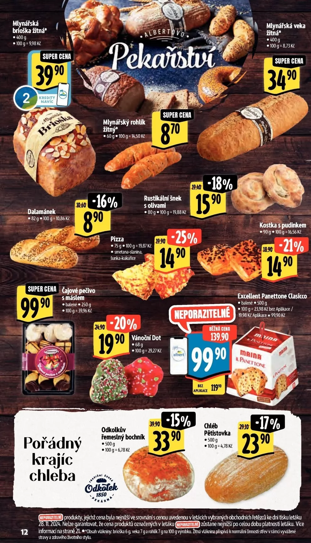 V letáku obchodu Albert najdete širokou nabídku kvalitních pekárenských výrobků. Mezi nimi se vyjímají mlynářská žitná brioška o hmotnosti 400 g za skvělou cenu 9,98 Kč za 100 g. Dále si můžete vychutnat dalamánek (82 g) a mlynářský žitný rohlík. Pro milovníky slaných pochoutek je tu rumální šnek s olivami a pizza s kombinací smetany a slaniny.