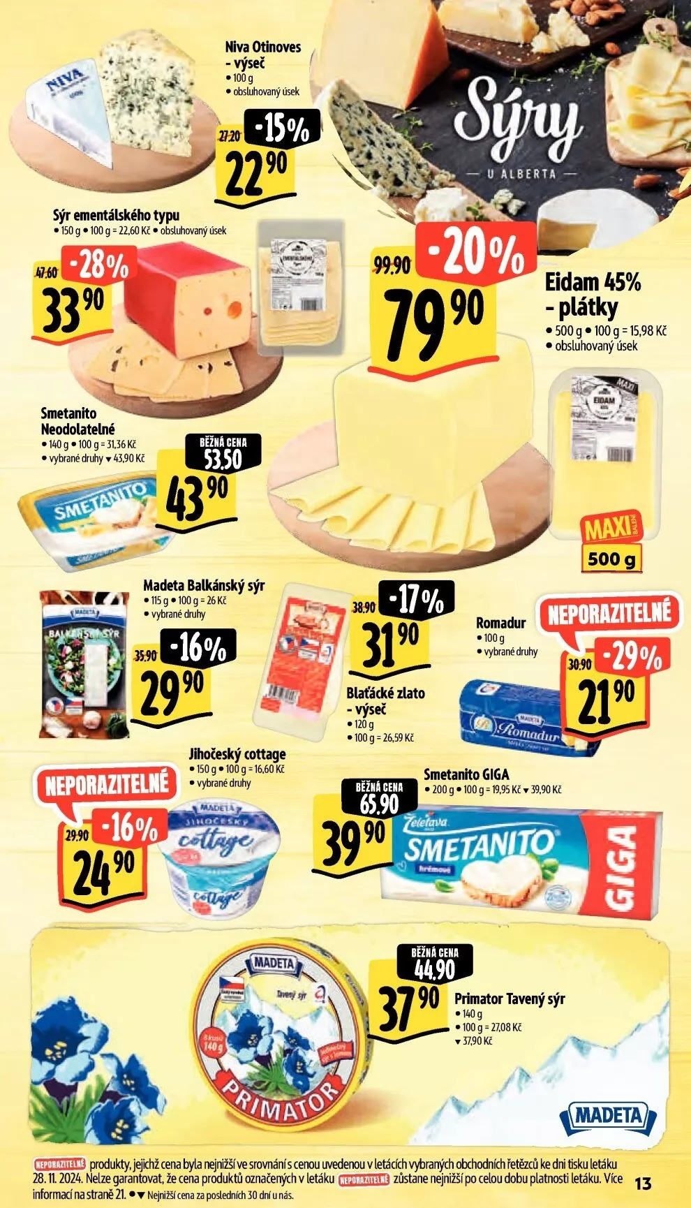 V letáku obchodu Albert najdete širokou nabídku kvalitních sýrů a mléčných výrobků. Mezi nimi se objevuje Niva Otinoves, která je dostupná v 100 g balení. Dále si můžete vybrat Ementálský sýr v 150 g balení za 22,60 Kč. Neodolatelné Smetanito je k dostání v 140 g balení za 31,36 Kč.