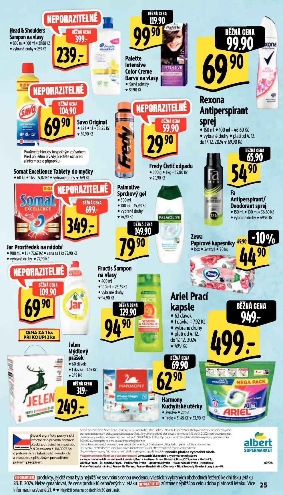 V letáku obchodu Albert najdete širokou nabídku produktů za výhodné ceny. Mezi nimi se objevují šampony na vlasy, jako je Head & Shoulders za 29,88 Kč a Fructis za 94,90 Kč. Pro údržbu domácnosti jsou k dispozici tablety do myčky Somat Excellence za 369 Kč a čistič odpadu Fredy za 22,90 Kč.