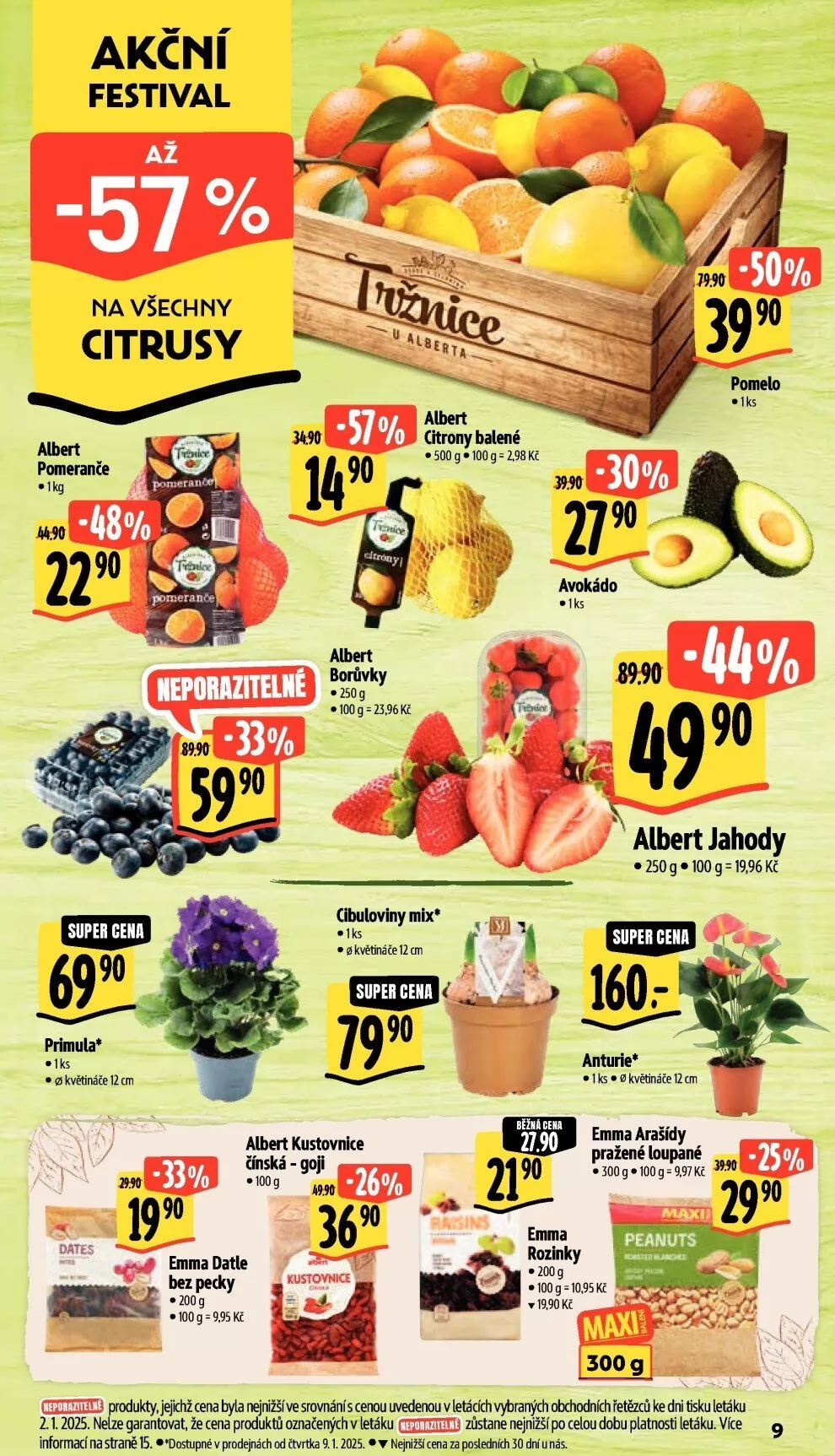 V letáku obchodu Albert najdete skvělé akční nabídky na citrusy! Pomeranče za super cenu 1 Kč za kus, citrony balené za 29,80 Kč a avokádo také za 8,90 Kč. Nezapomeňte na borůvky 250 g za 19,96 Kč a jahody 250 g za 19,96 Kč.