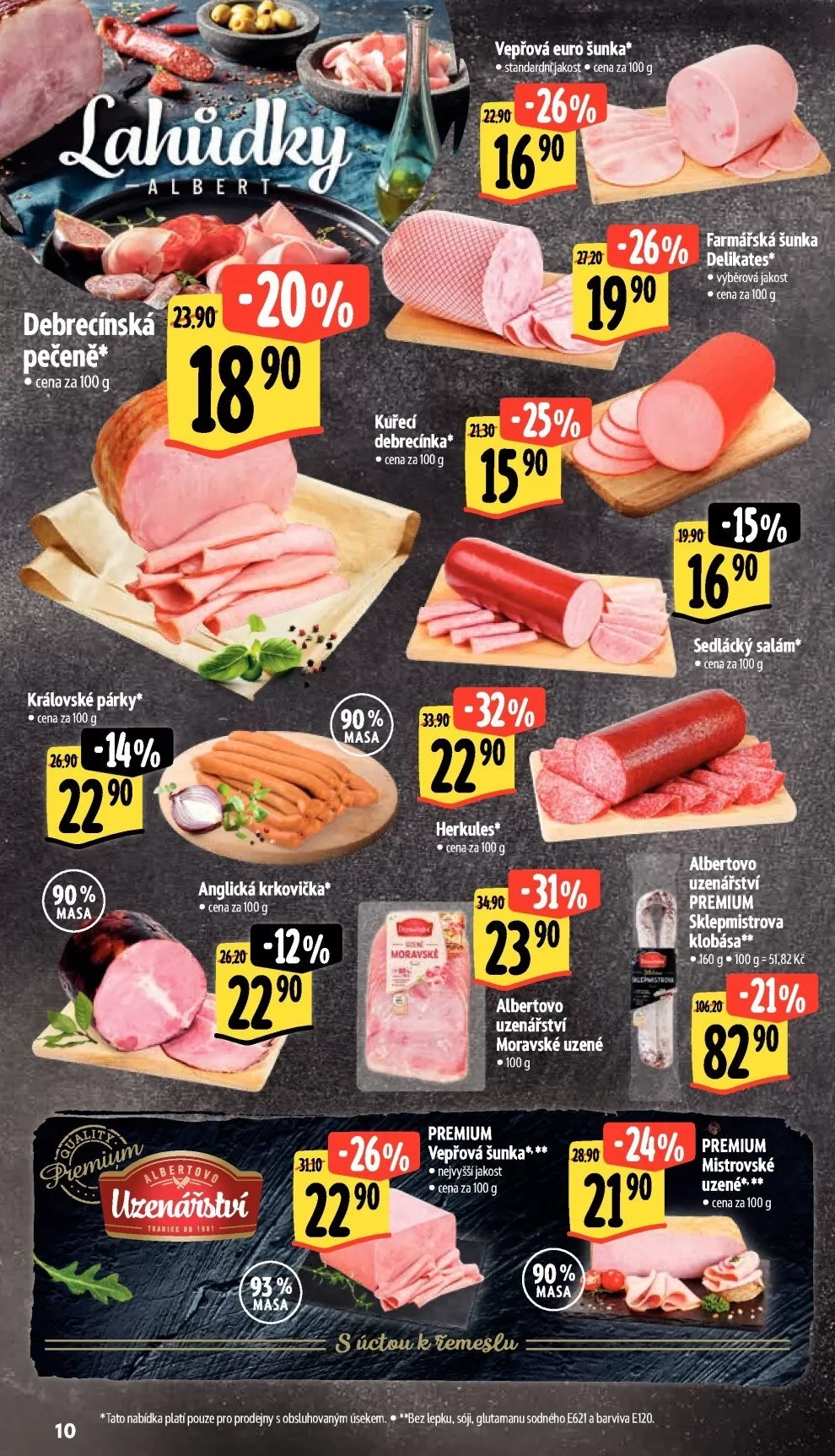 V letáku obchodu Albert najdete širokou nabídku kvalitních masných výrobků. Mezi nimi se nachází vepřová euro šunka za 2390 Kč za 100 g, debrecínská pečeně a královské párky, které stojí 26,90 Kč za 100 g. Dále si můžete vybrat anglickou krkovičku a kuřecí debrecínku, obě s obsahem 90 % masa.