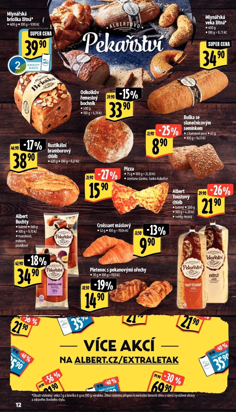 V letáku obchodu Albert najdete širokou nabídku kvalitních pekárenských výrobků. Mezi nimi se objevuje mlynářská brioška žitná, která je nyní za super cenu. Dále si můžete vychutnat rustikální bramborový chléb, řemeslný bochník nebo chutné tvarohové a makové buchty. Nezapomeňte také na oblíbenou pizzu se smetanou a šunkou nebo máslový croissant. Pro milovníky zdravějších variant je k dispozici žitná veka a bulka se slunečnicovým semínkem, pečená v kamenné peci. Všechny tyto produkty jsou bohaté na vlákninu, která přispívá k normální činnosti střev. Navštivte albert.cz/extraletak pro více akcí a informací!