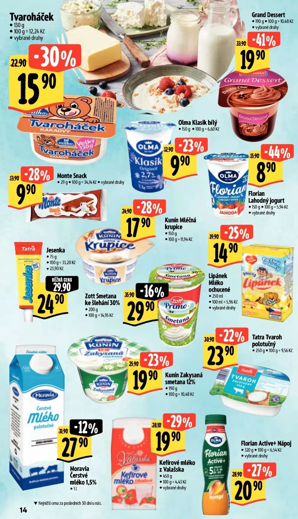 Nezapomeňte také na lahodné jogurty od značky Florian a čerstvé mléko Moravia (1,5 %) za skvělou cenu. Pro přípravu dezertů je ideální Zott smetana ke šlehání (200 g) a Kunín zakysaná smetana (190 g).